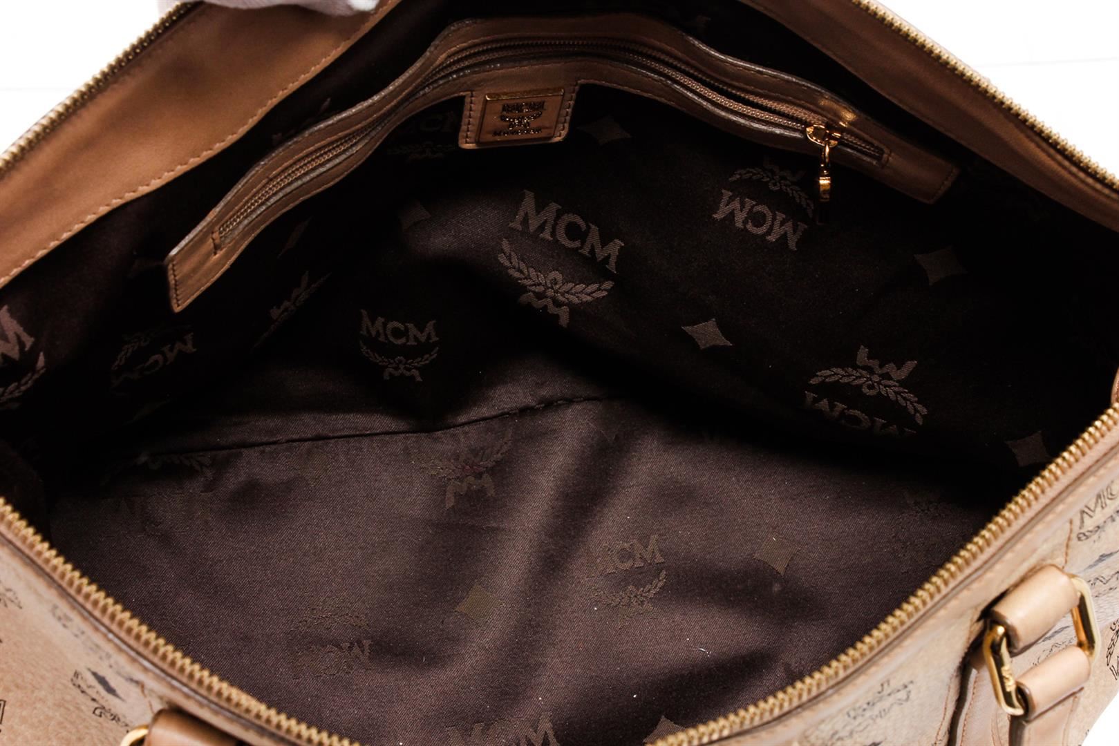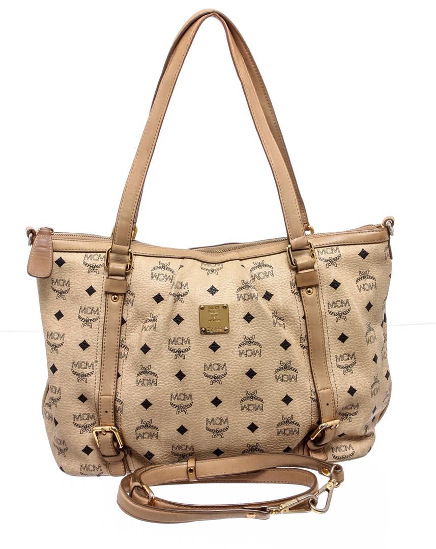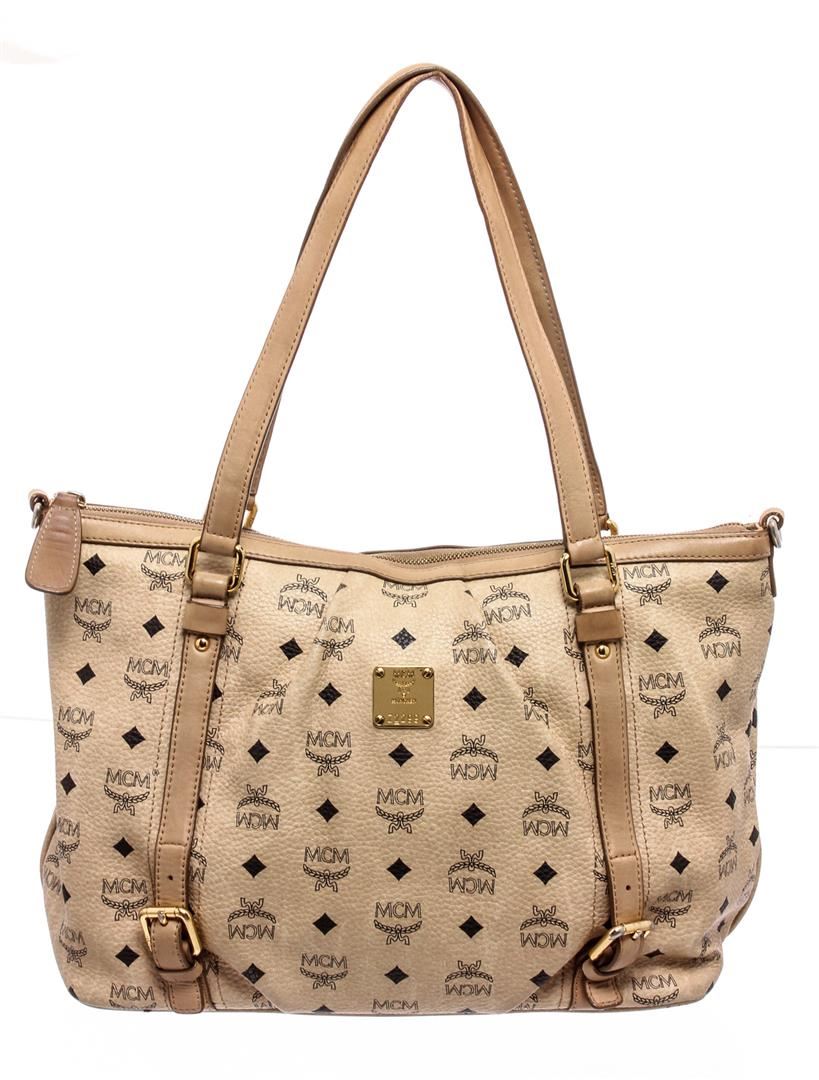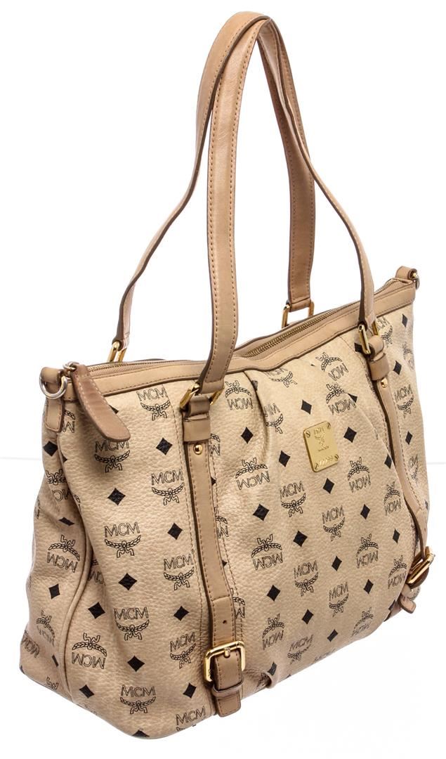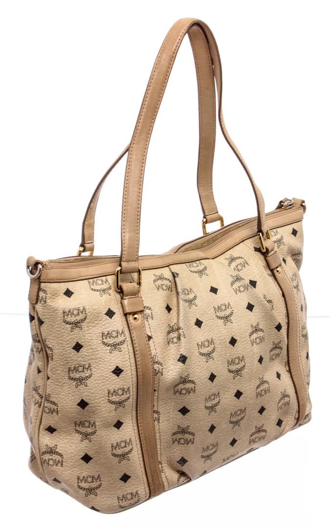 Cream Visetos MCM coated canvas and leather trim medium satchel tote bag with gold-tone hardware, dual flat handles, brown canvas lining, one zip pocket at interior wall and zip top closure at top.