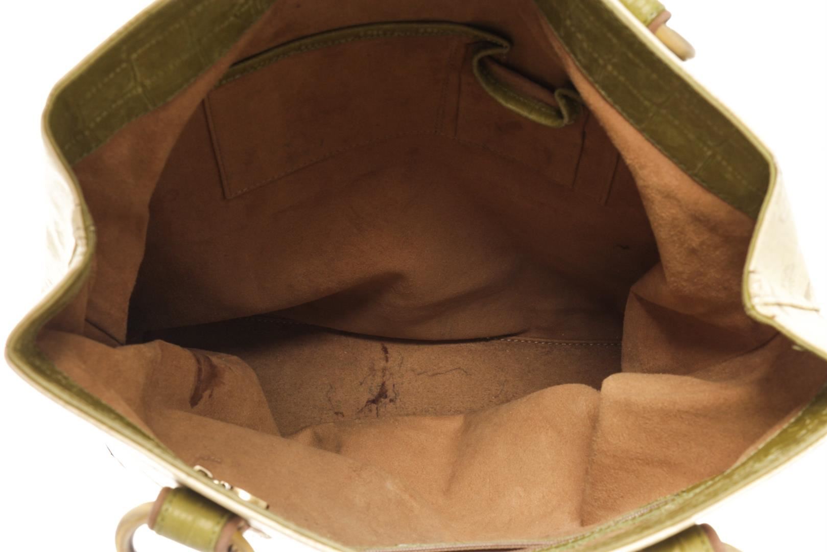 One MCM Green Leather Shoulder Bag. Item is sold AS-IS. All available information is listed in the description and shown in the photo. MCM Green Leather Shoulder Bag with top handle, suede lining, interior slip pockets, green leather, gold tone hardware and snap closure. There are marks on the suede lining. Please refer to photos.