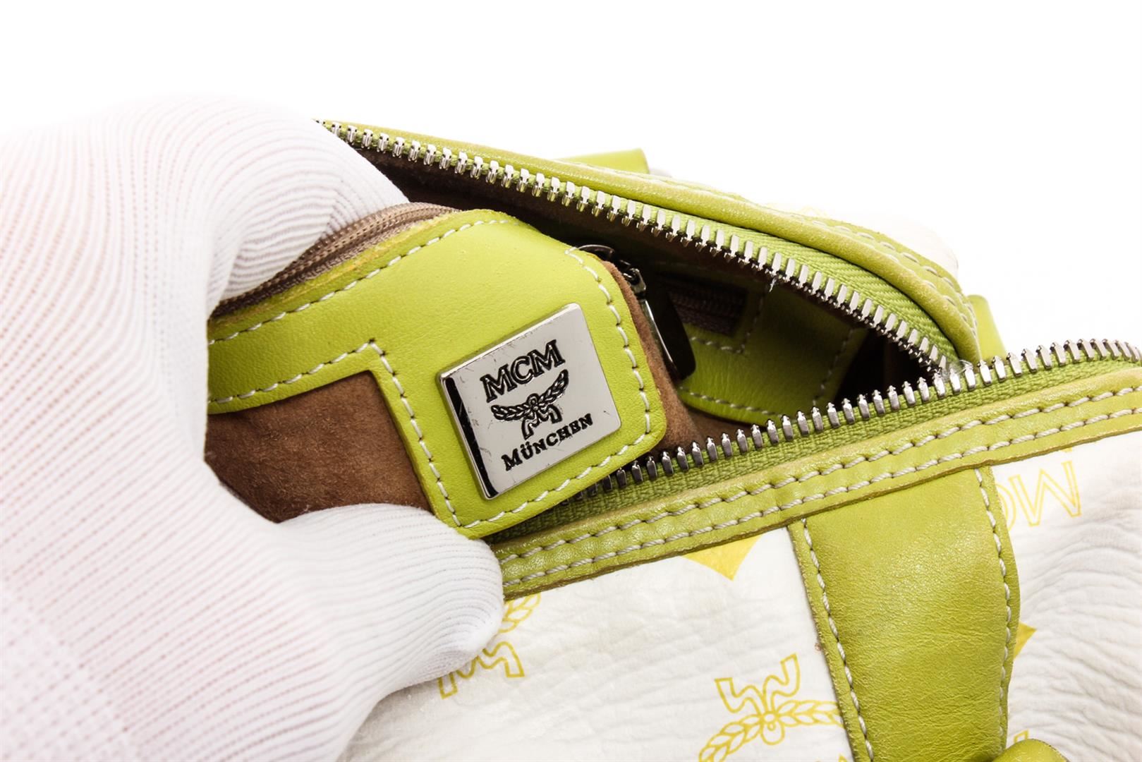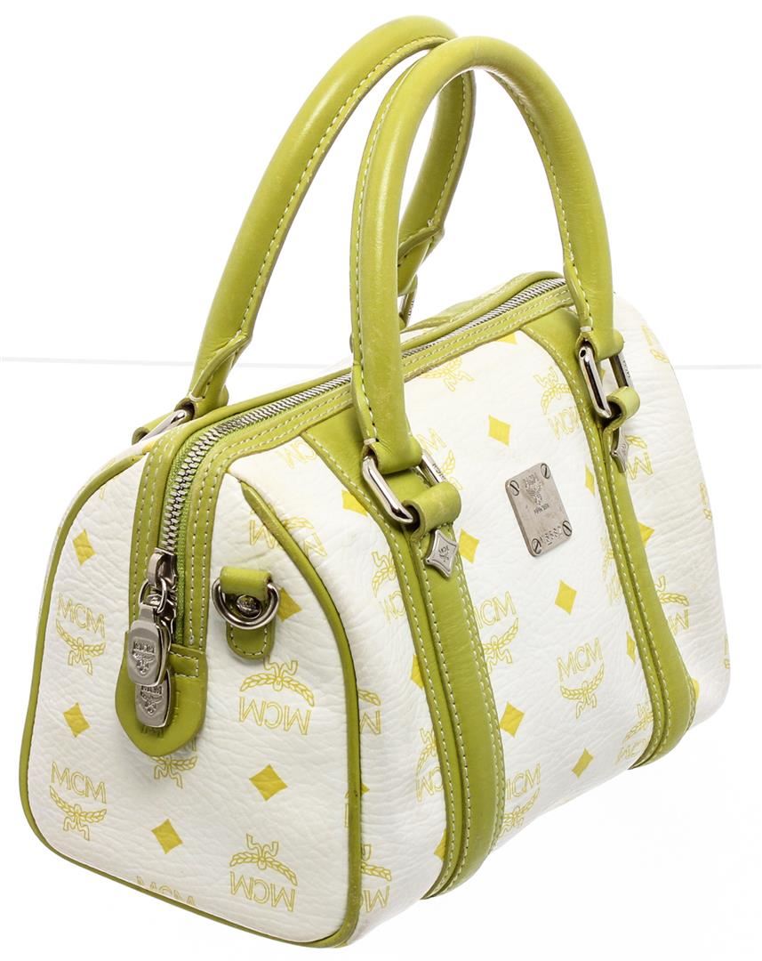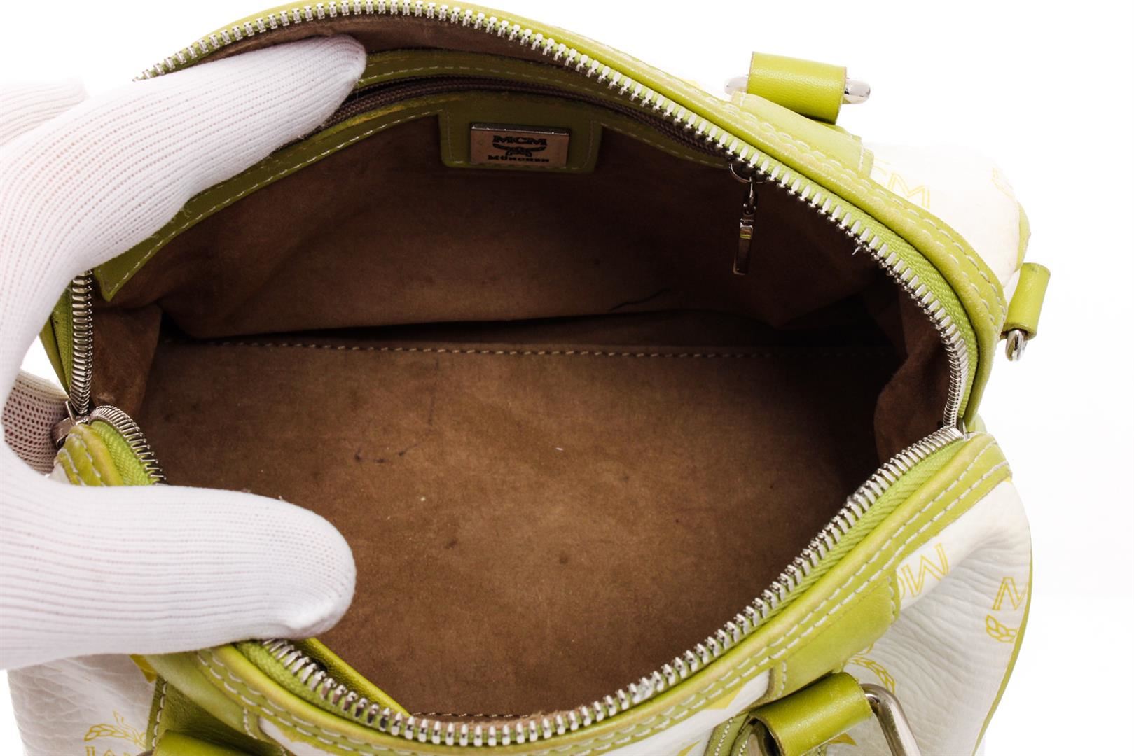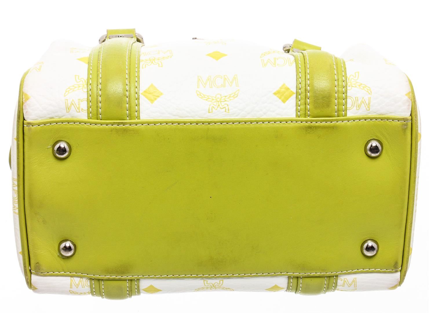 MCM green & white Visetos coated canvas leather Boston bag with silver-tone hardware, dual rolled top handles and optional detachable shoulder strap, logo placard at front, protective feet at base, brown suede interior lining, one interior pocket with zip closure and overall zip closure at top.