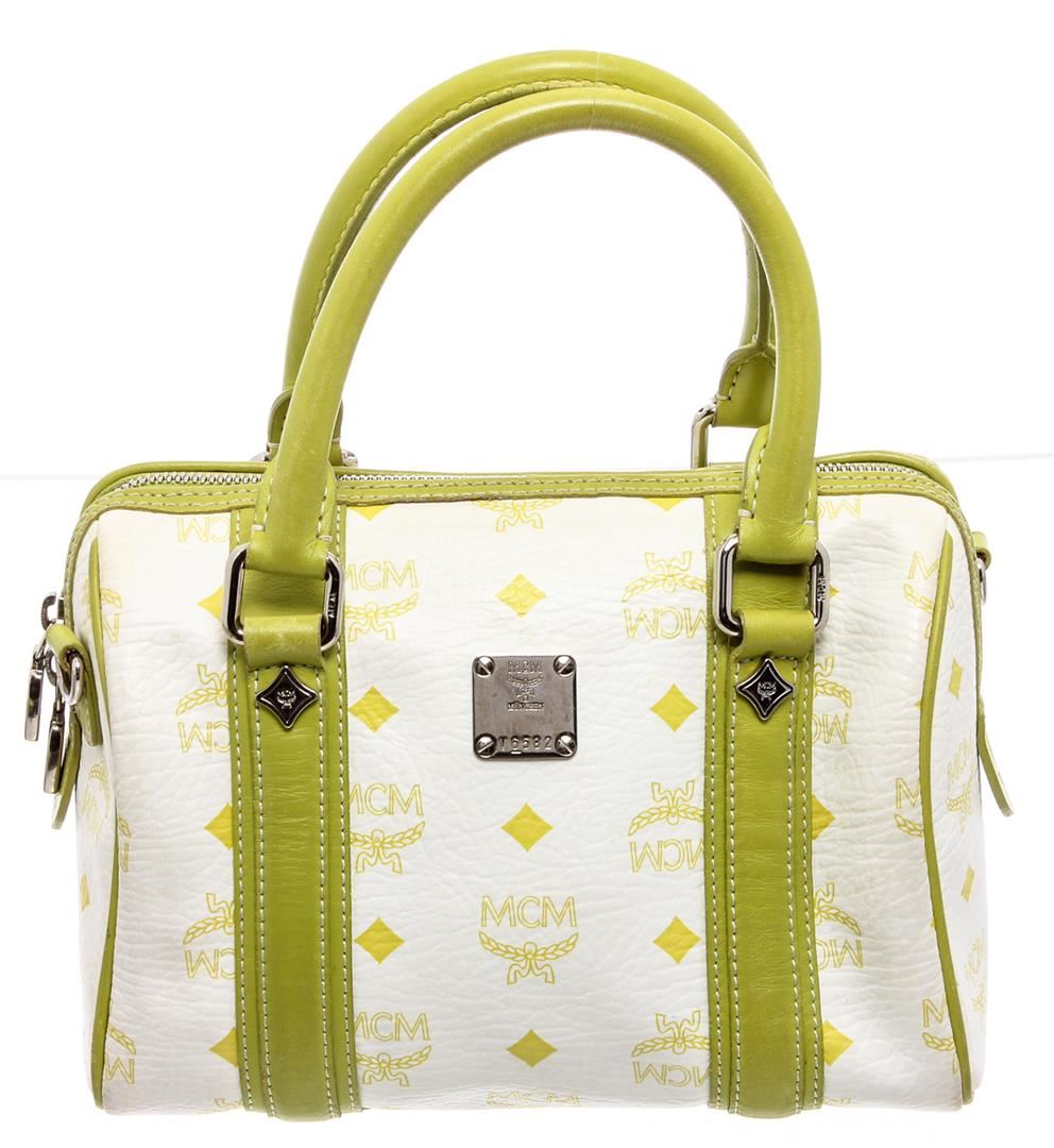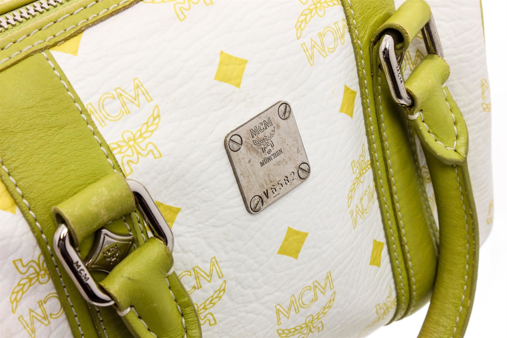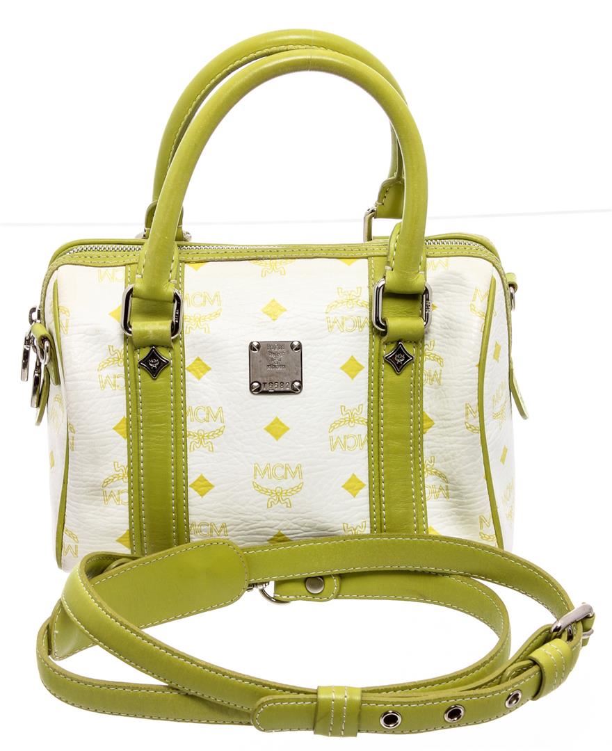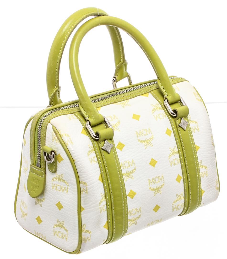 MCM green & white Visetos coated canvas leather Boston bag with silver-tone hardware, dual rolled top handles and optional detachable shoulder strap, logo placard at front, protective feet at base, brown suede interior lining, one interior pocket with zip closure and overall zip closure at top.
