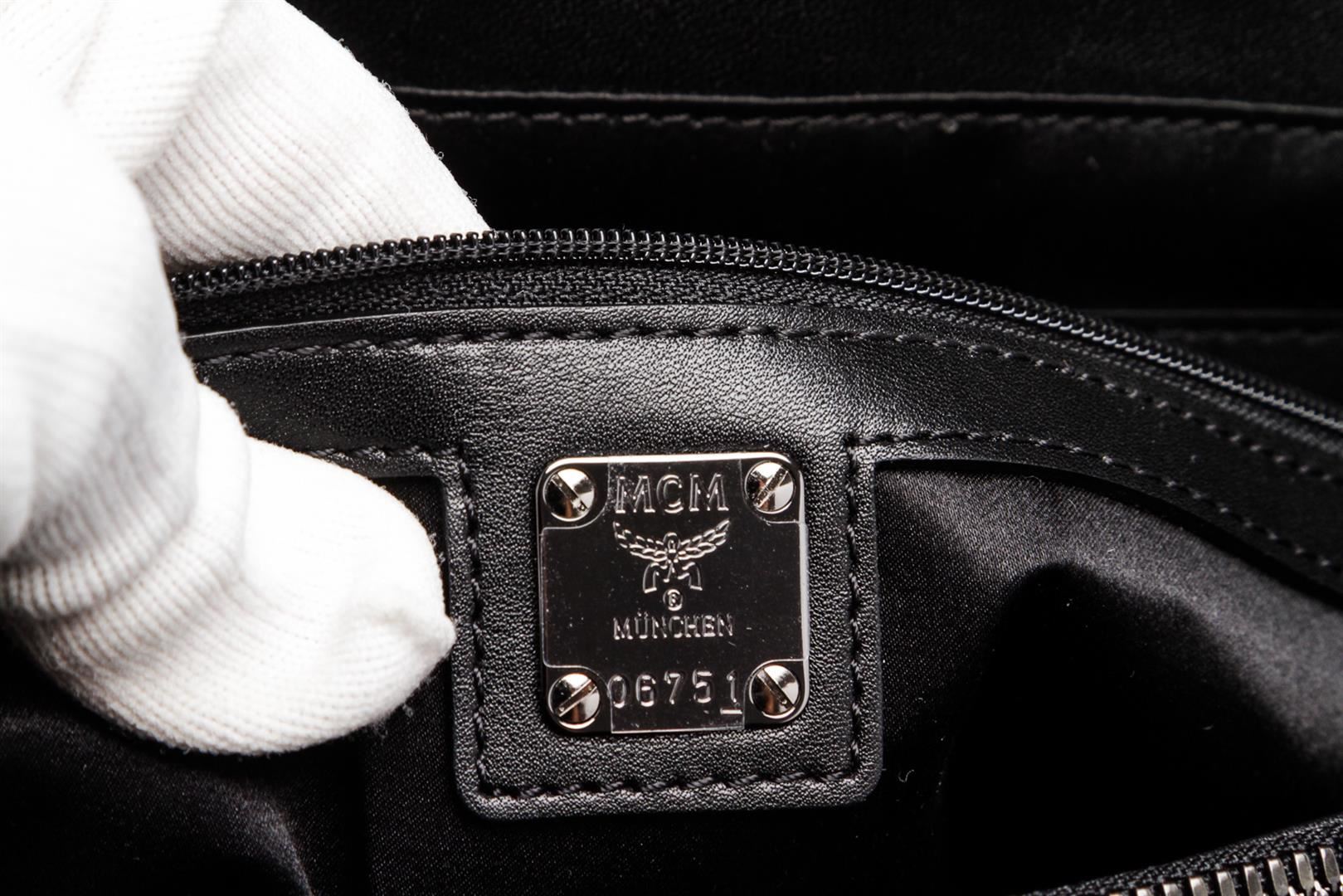 Black leather MCM M. Moment messenger bag contains tonal stitching, debossed stud details at front face and detachable shoulder strap. Interior is satin lined and contains two compartments, one zipper two zipper pockets, and two side slip pockets. Exterior contains a zip pocket under the dual magnetic flap closure at front.