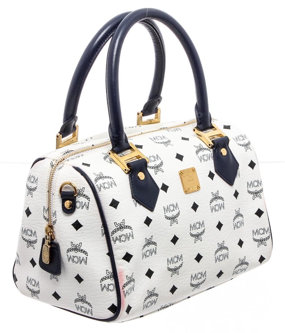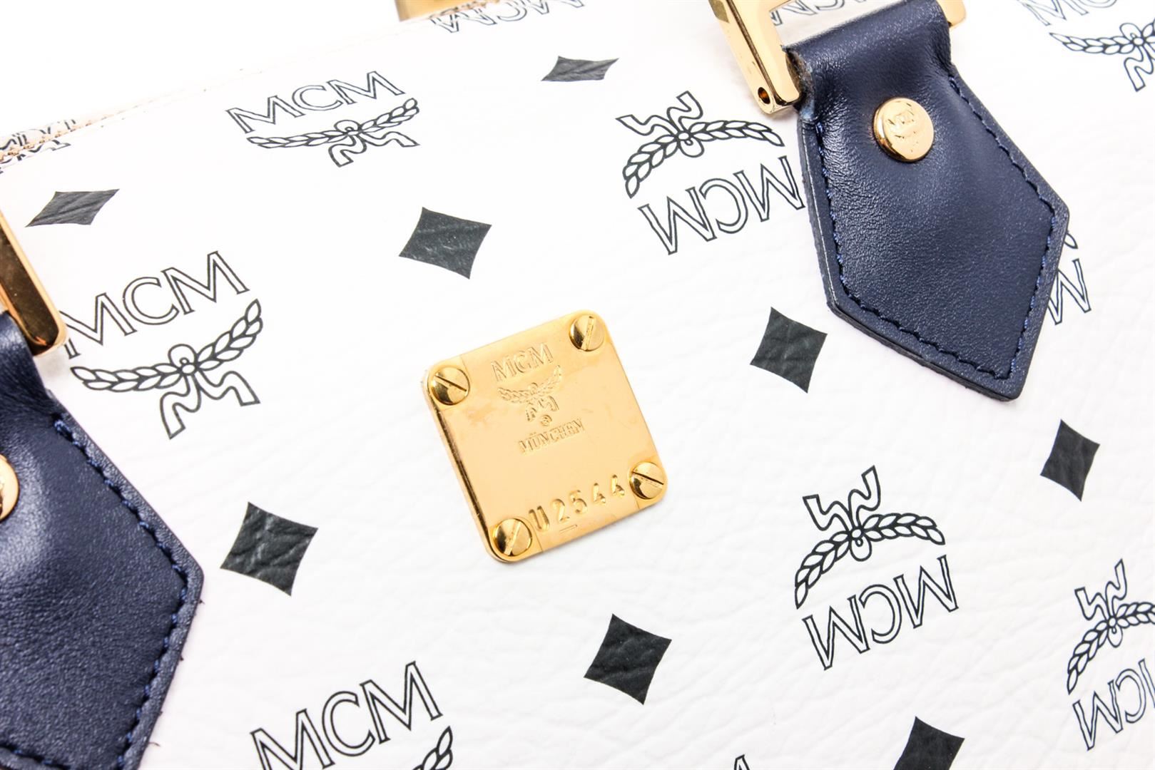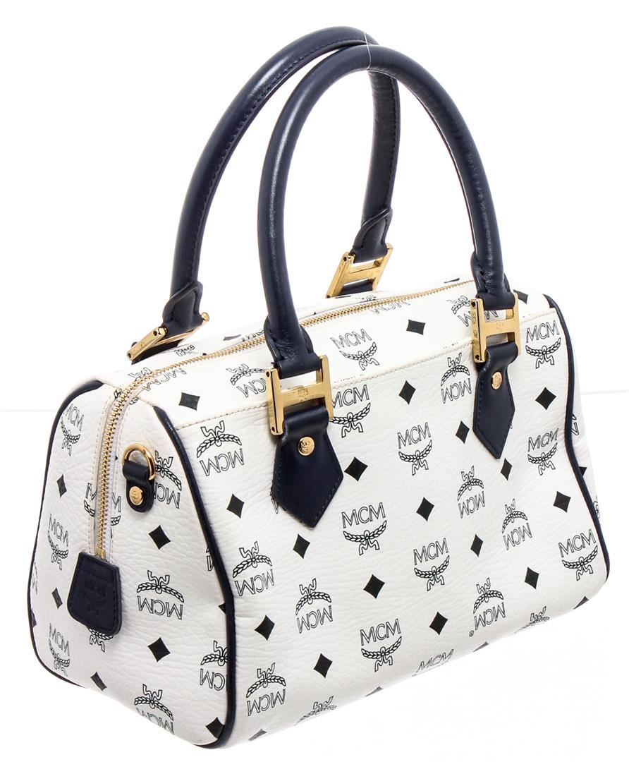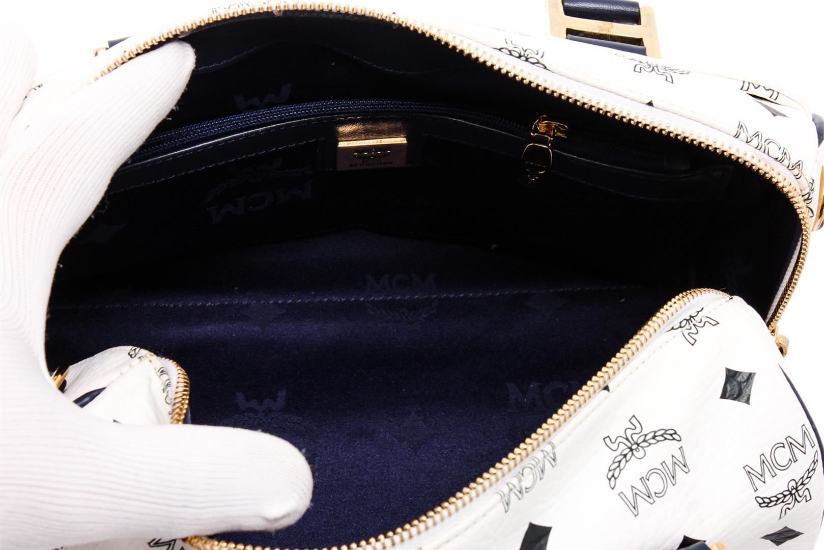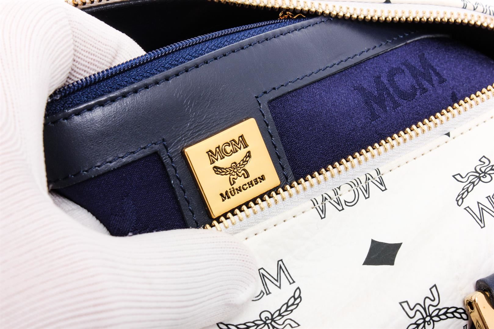 White and navy Visetos coated canvas vintage MCM Boston bag with gold-tone hardware, dual rolled top handles, navy leather trim, logo placard at front, protective feet at base, navy logo jacquard woven lining, dual pockets at interior walls; one with zip closure and zip-around closure at top.