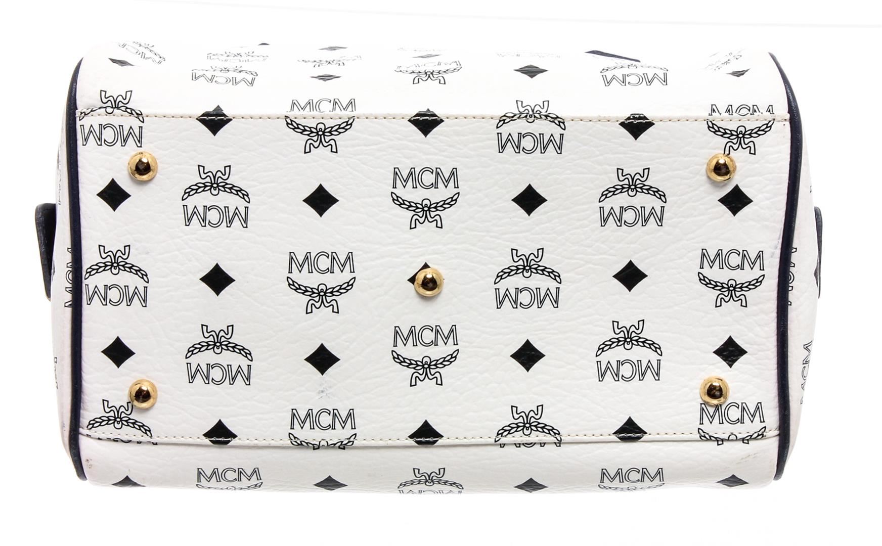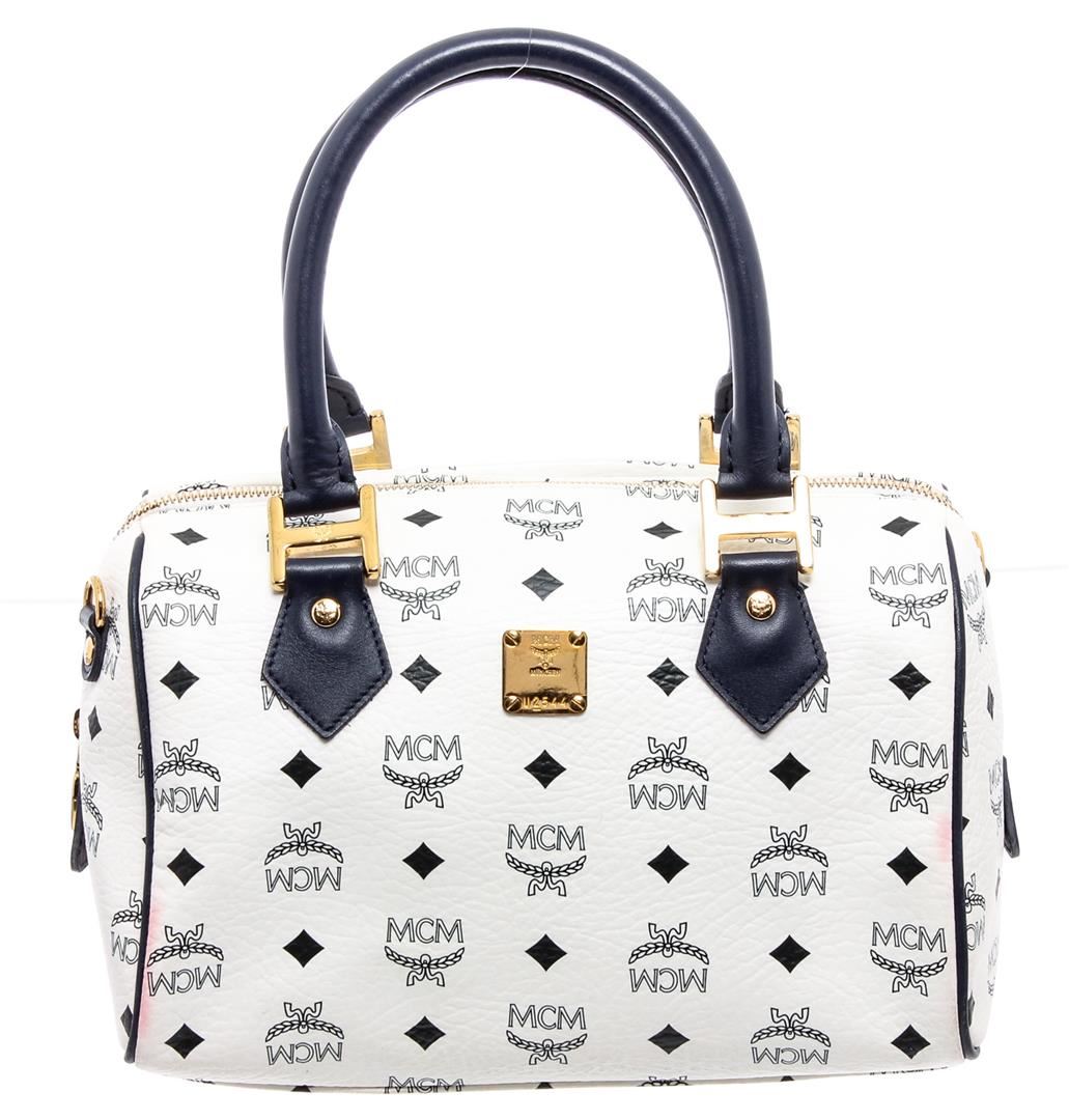 White and navy Visetos coated canvas vintage MCM Boston bag with gold-tone hardware, dual rolled top handles, navy leather trim, logo placard at front, protective feet at base, navy logo jacquard woven lining, dual pockets at interior walls; one with zip closure and zip-around closure at top.