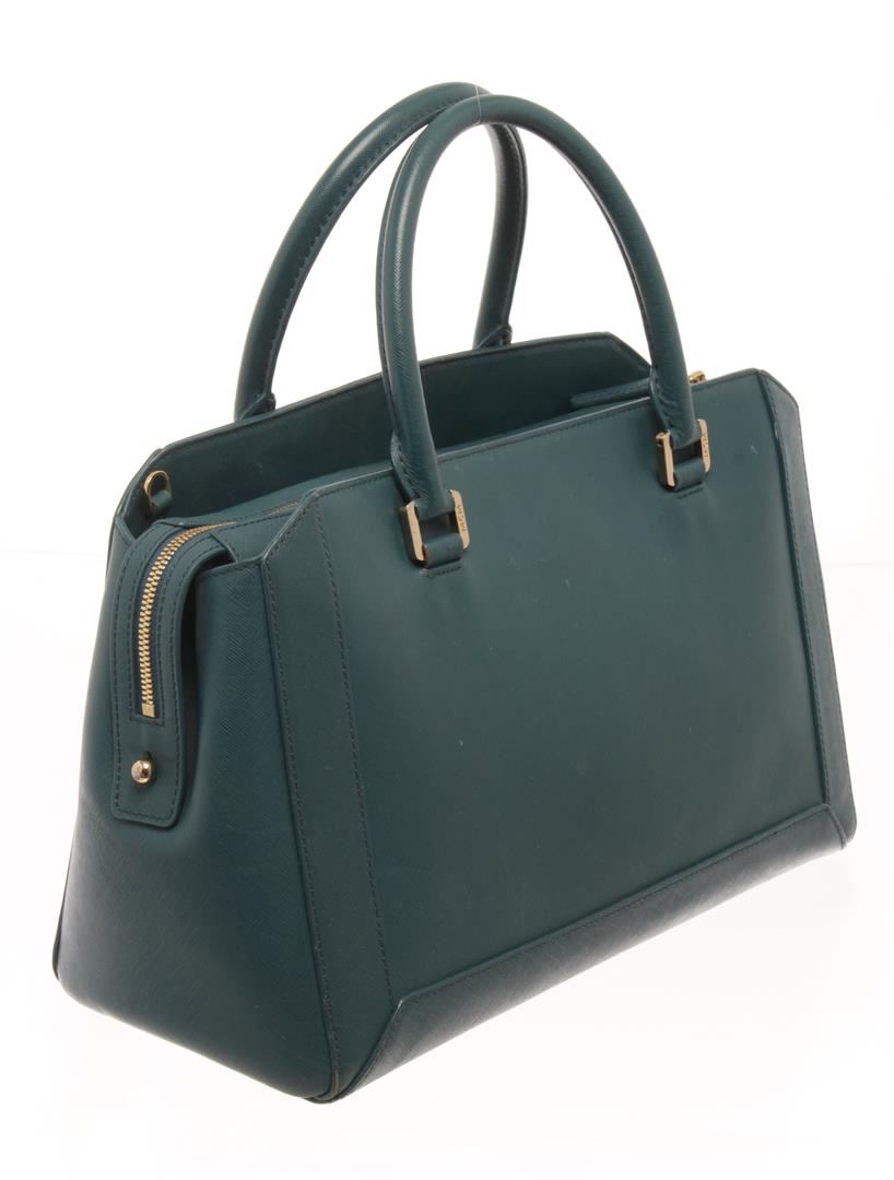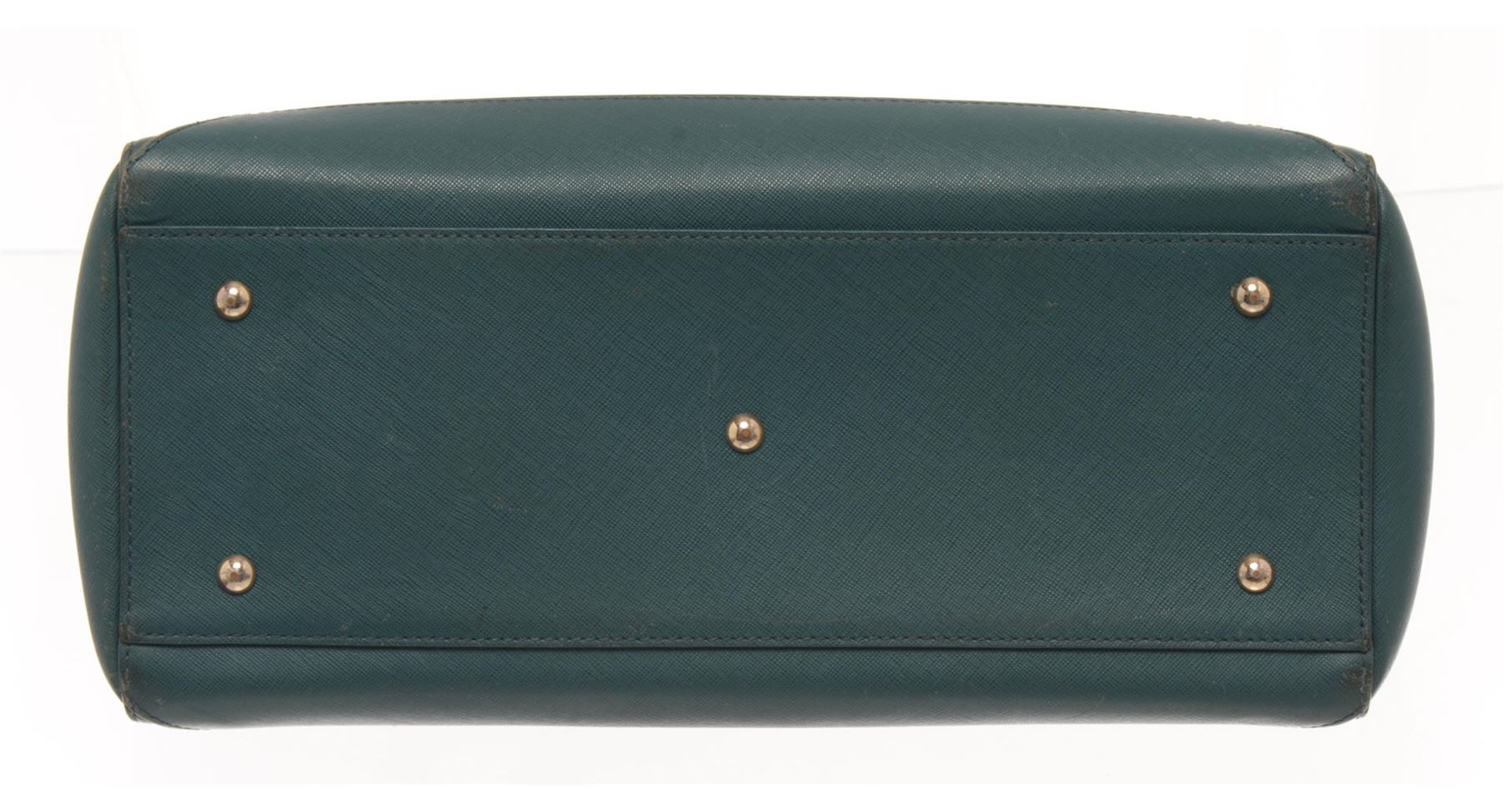 MCM Teal Leather 2 Way Shoulder Bag. All available information is listed in the description and shown in the photos. mcm teal leather 2 way shoulder bag with Gold-Tone Hardware, Rolled Handles & Single Adjustable Shoulder Strap, Leather Trim, Logo Jacquard Lining & Five Interior Pockets, Zip Closure at Top. Height: 8.5", Width: 12.25", Depth: 4.5"