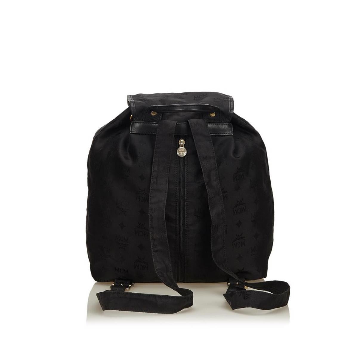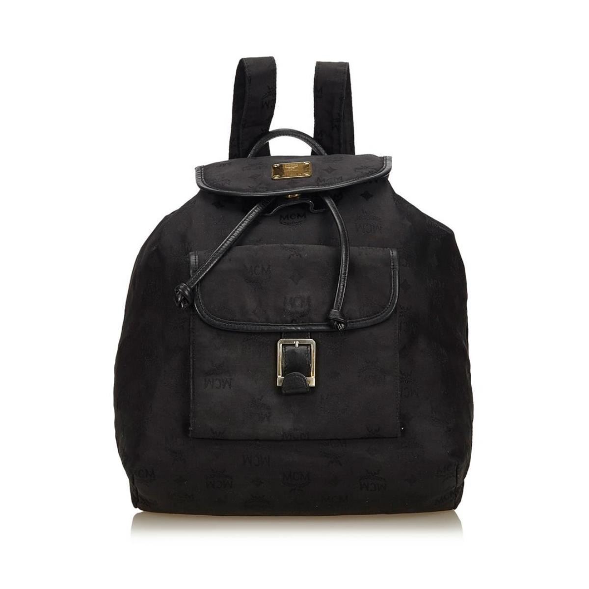 This backpack features a nylon body with leather trim, flat back straps, flat top handle, top flap with buckle closure, drawstring closure, exterior flap pockets with magnetic snap button closures and zip pocket, and interior zip pocket.