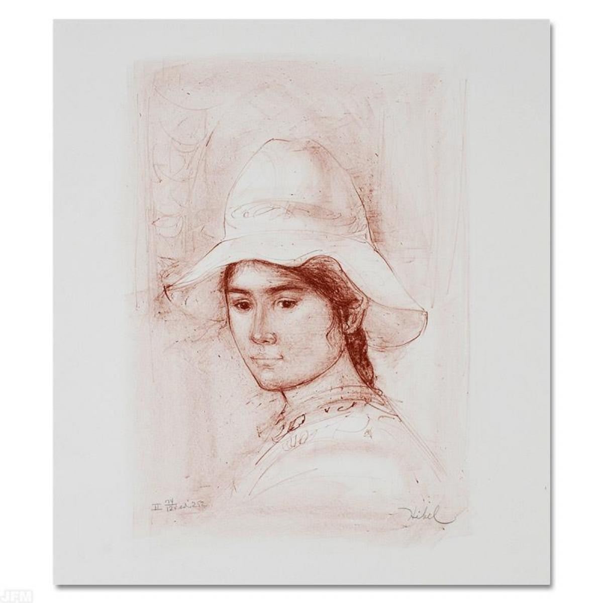 "Magda" is a limited edition lithograph on paper, numbered and hand signed by Edna Hibel (1917-2014). Includes Certificate of Authenticity! Measures approx. 18" x 22" (with border), 12" x 16.5" (image).