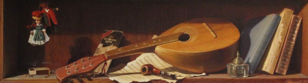 Mandolin by Dimitri Annenkov framed original oil on canvas featuring sheet music, a pipe, and a mandolin on a wooden table. Sized at 23" x 49 1/2".