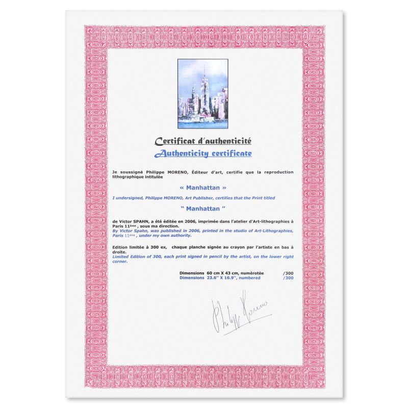 "Manhattan" is a limited edition lithograph on paper by Victor Spahn. Printed at Art-Lithographies workshop in Paris, the piece is hand signed by the artist and comes with a certificate of authenticity. Measures approximately 23.5" x 17" (image).