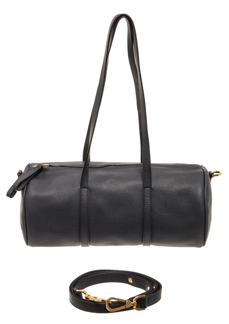 Mansur Gavriel Black Leather Duffle Mini Bag. All available information is listed in the description and shown in the photos. Mansur Gavriel Black Leather Duffle Mini Bag with gold-tone hardware, black leather trim, gold-tone metal strap rings at both sides, gold-tone logo embossed at the bottom front, black leather lining, single leather adjustable & detachable long shoulder strap, dual leather flap top handles, and zip closure at the top. .