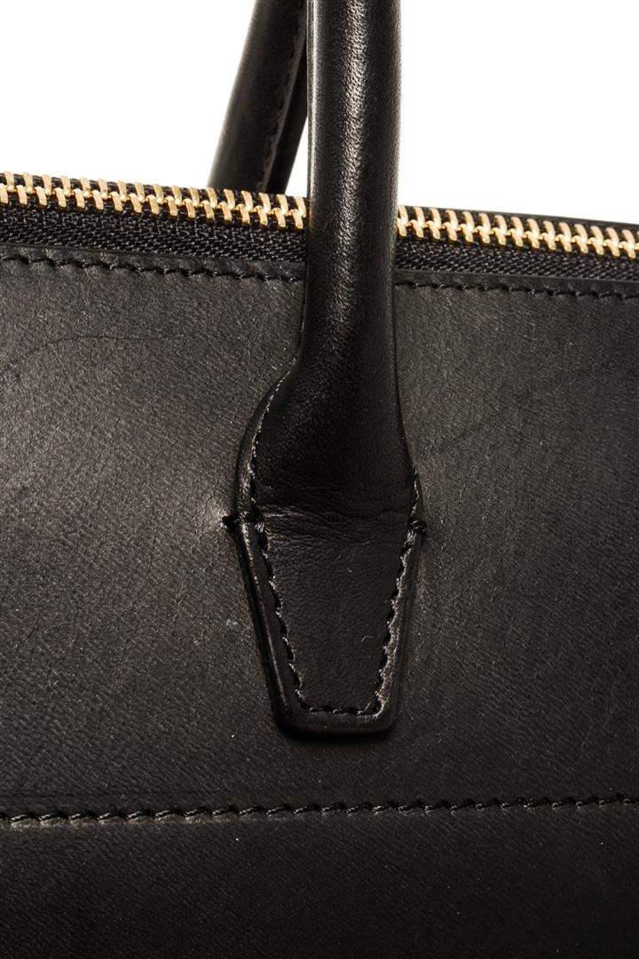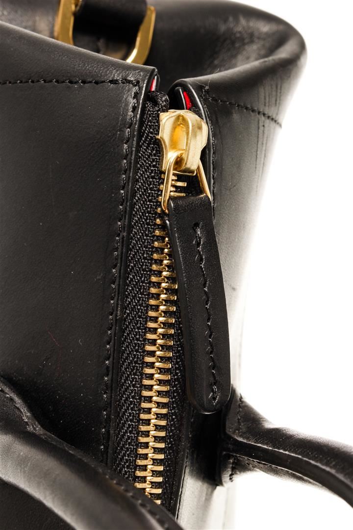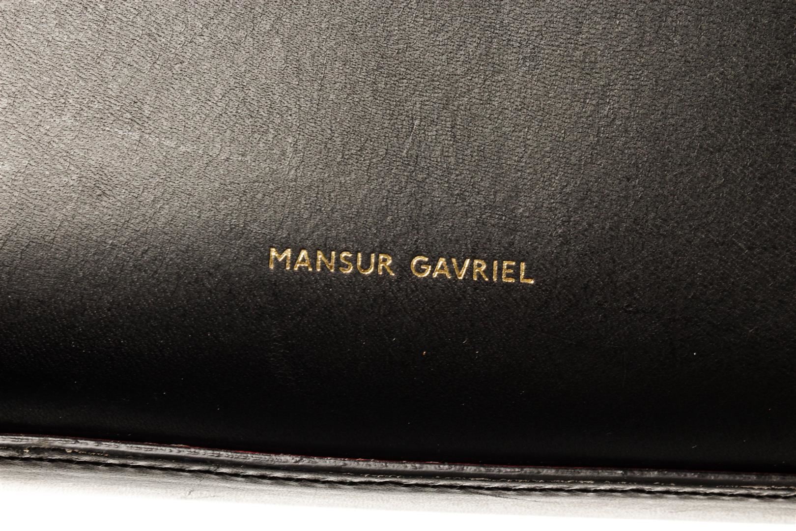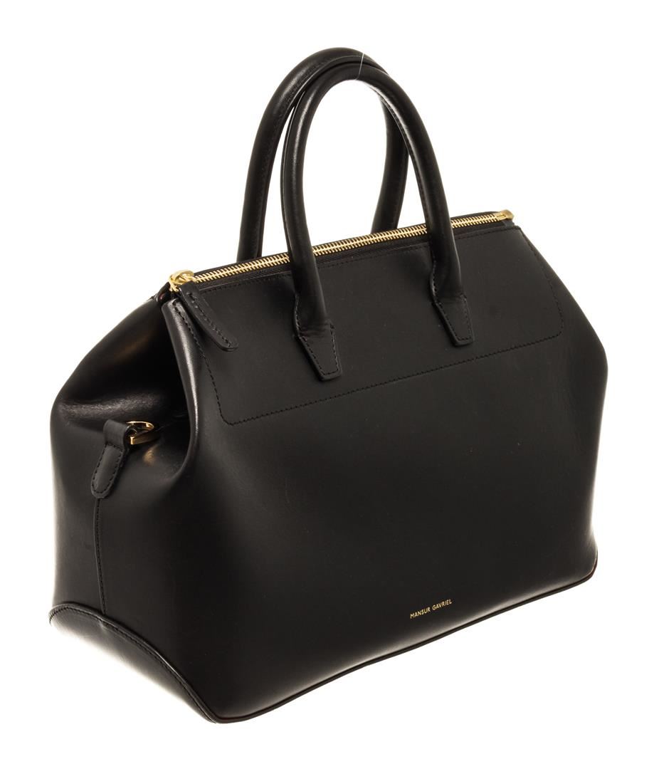 Mansur Gavriel Black Leather Travel Bag. All available information is listed in the description and shown in the photos. Mansur Gavirel Black Leather Travel Bag with Gold-tone hardware, Red Leather Lining, Adjustable Long Shoulder Strap, Interior Zip Pocket, Dual Top Handles, and Zipper Closure at the top.