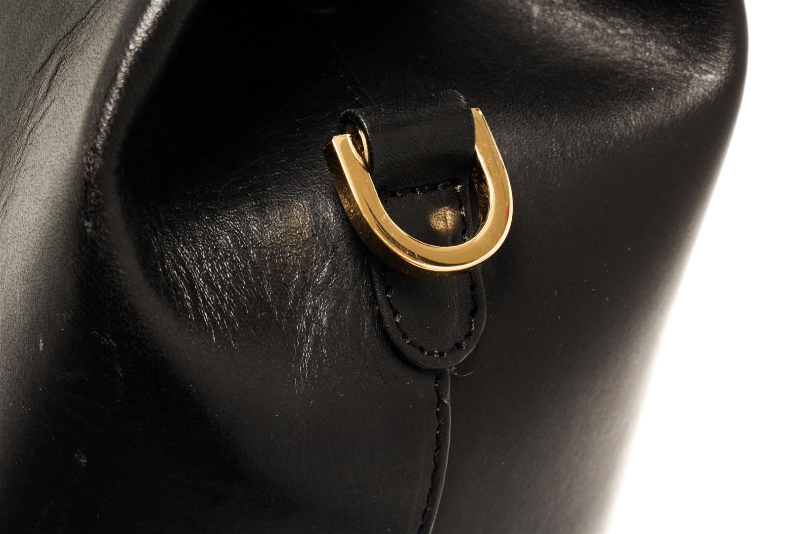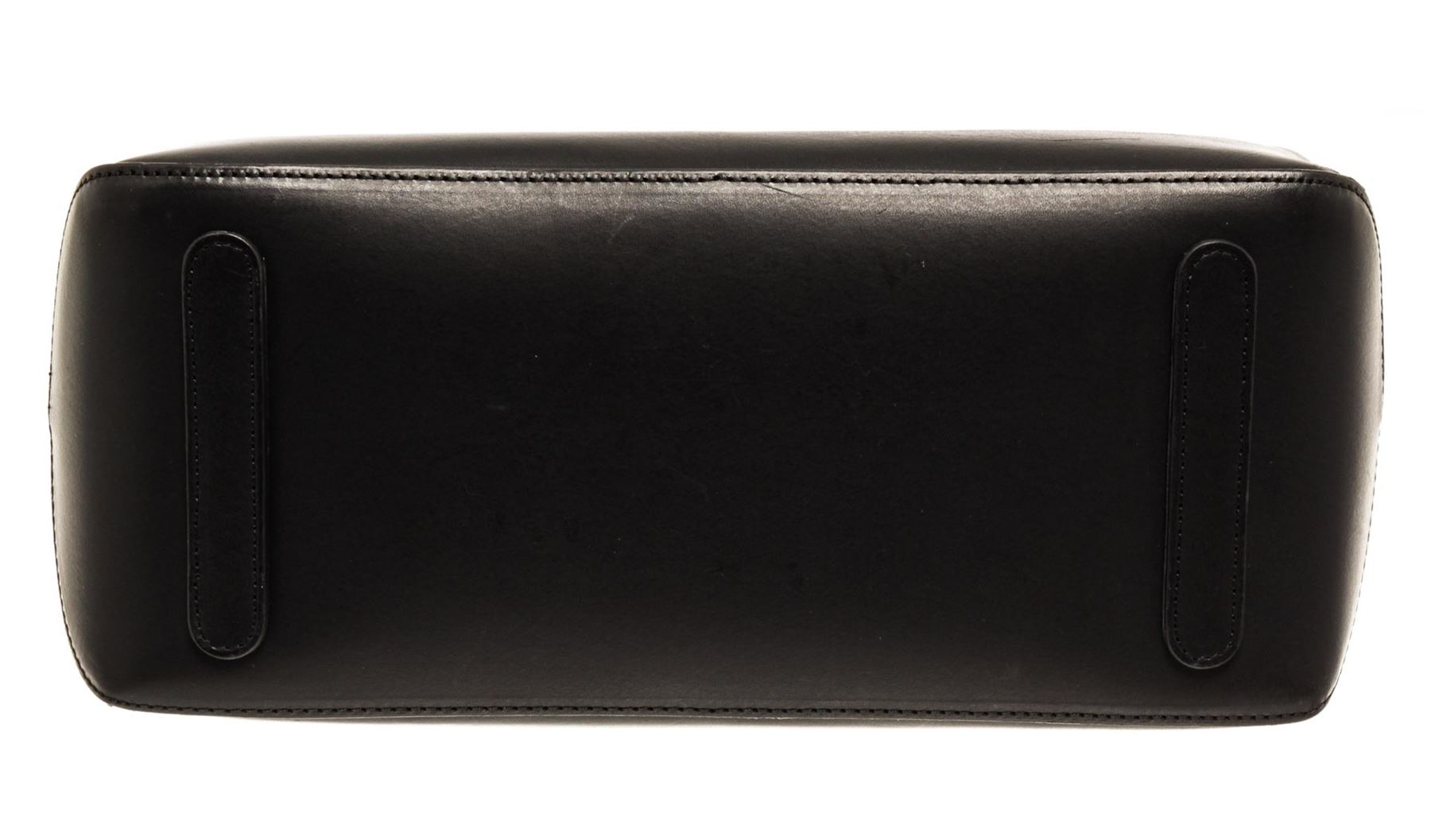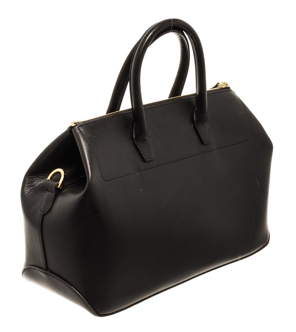 Mansur Gavriel Black Leather Travel Bag. All available information is listed in the description and shown in the photos. Mansur Gavirel Black Leather Travel Bag with Gold-tone hardware, Red Leather Lining, Adjustable Long Shoulder Strap, Interior Zip Pocket, Dual Top Handles, and Zipper Closure at the top.