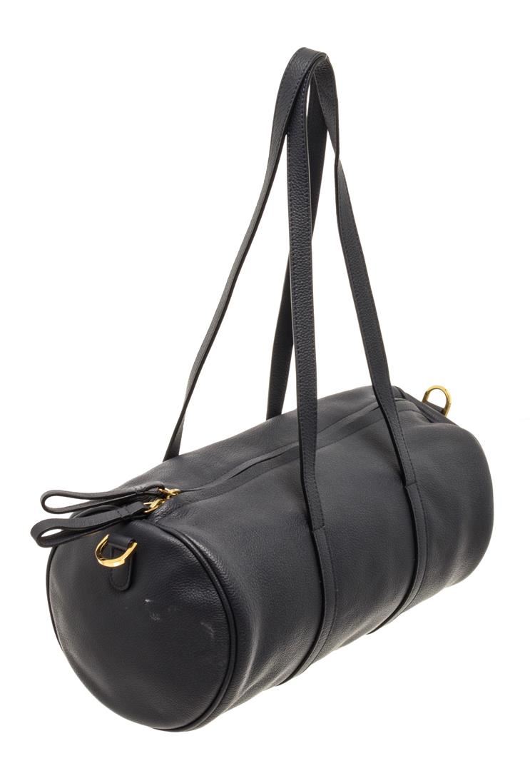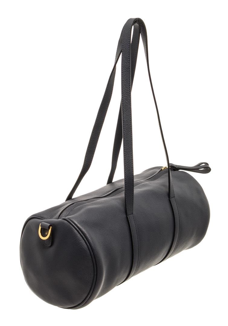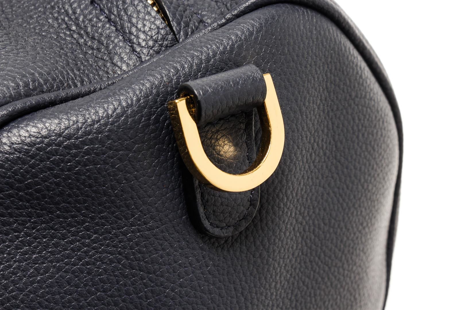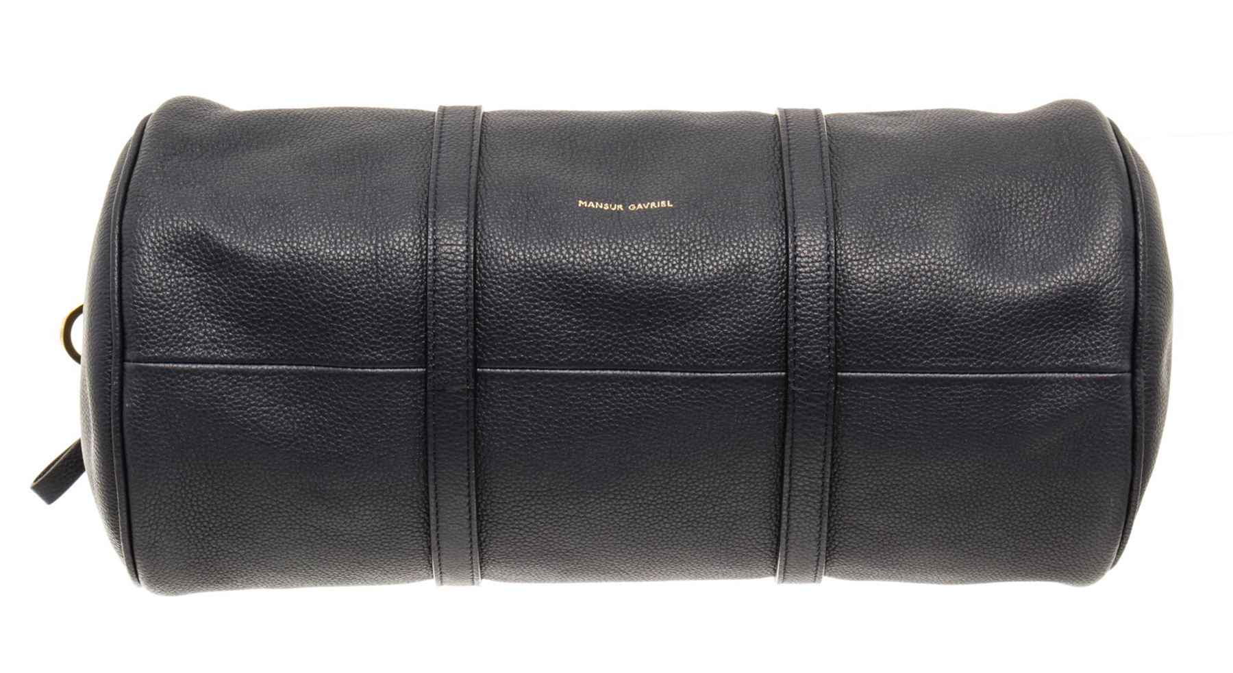 Mansur Gavriel Navy Blue Lambskin Leather Mini Duffle Crossbody Bag. All available information is listed in the description and shown in the photos. Mansur Gavriel Navy Blue Lambskin Leather Mini Duffle Crossbody Bag with gold-tone hardware, navy blue leather trim, gold-tone metal strap rings at both sides, gold-tone logo embossed at the bottom front, black leather lining, single leather adjustable & detachable long shoulder strap, dual leather flap top handles, and zip closure at the top. .