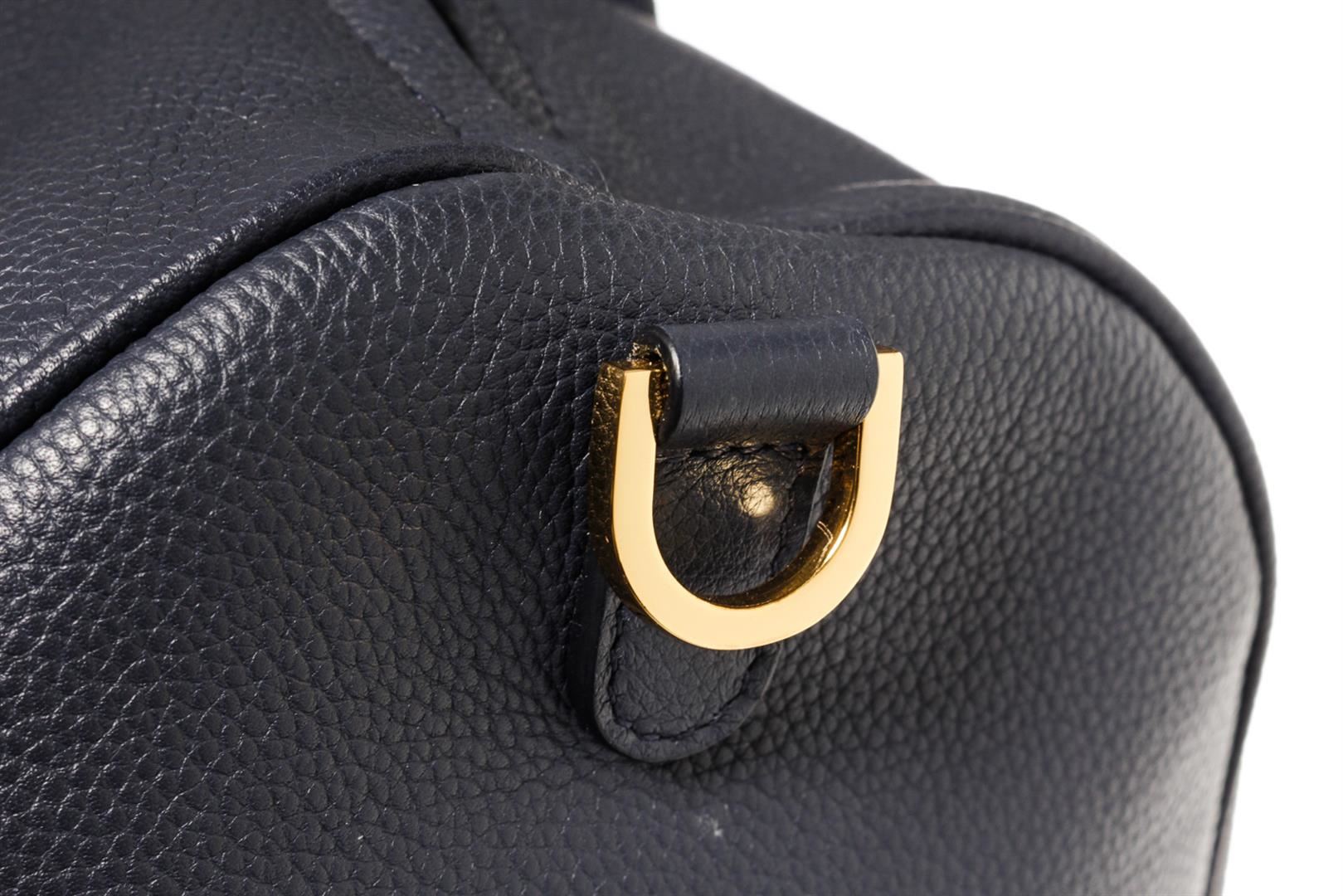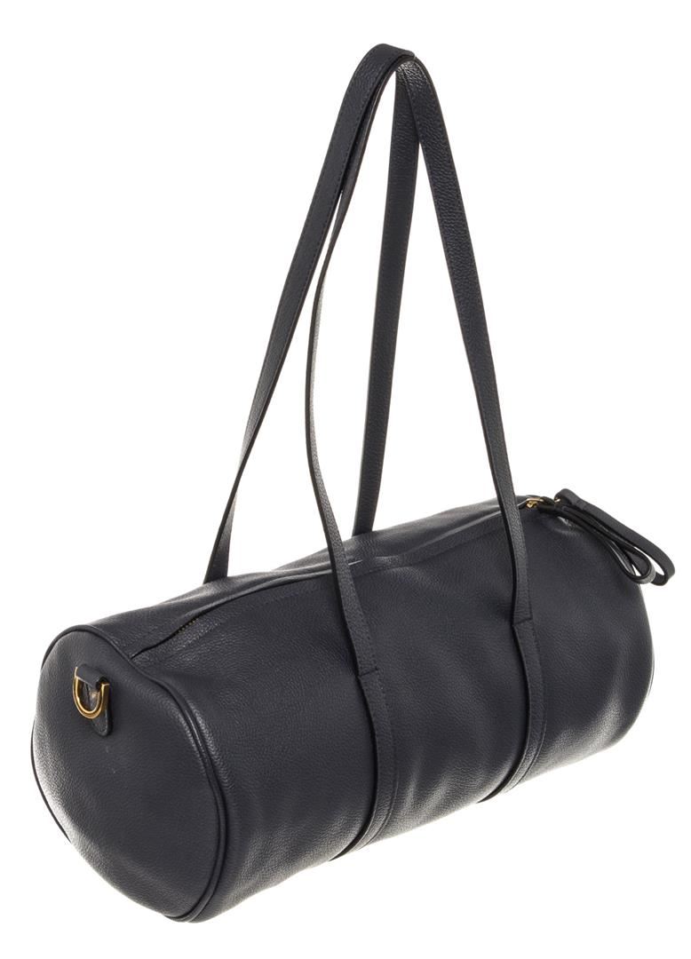 One Mansur Gavriel Navy Blue Lambskin Leather Mini Duffle Shoulder Bag. Item is sold AS-IS. All available information is listed in the description and shown in the photo. Mansur Gavriel Mini Duffle shoulder bag is crafted in navy blue Lambskin leather, gold-tone hardware, two top flat handles, two-way zip closure at top and black leather lining. 8.5" L x 4" W x 4" H, Handle Drop: 5"