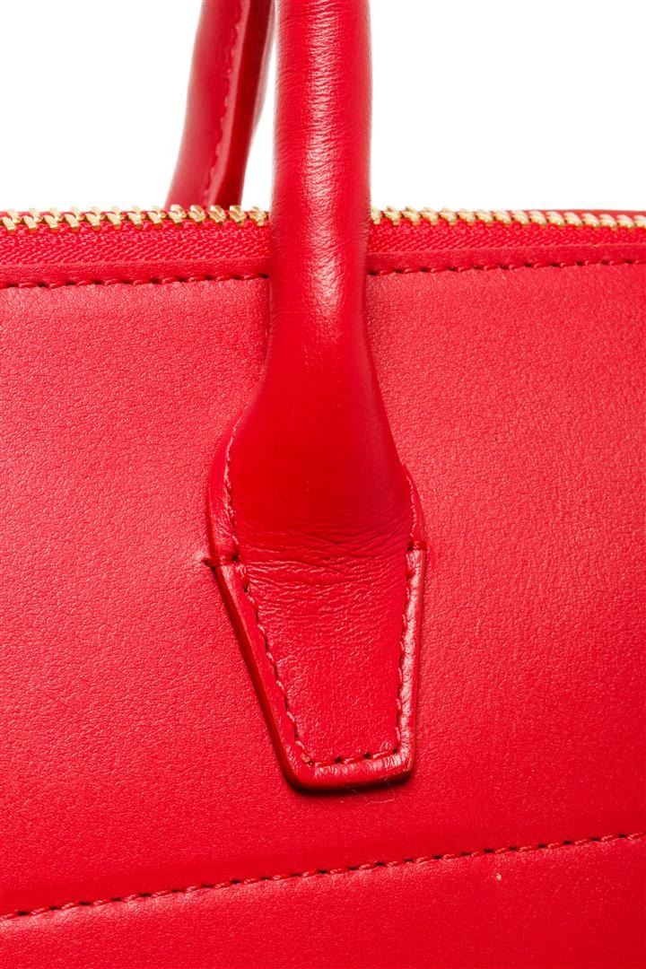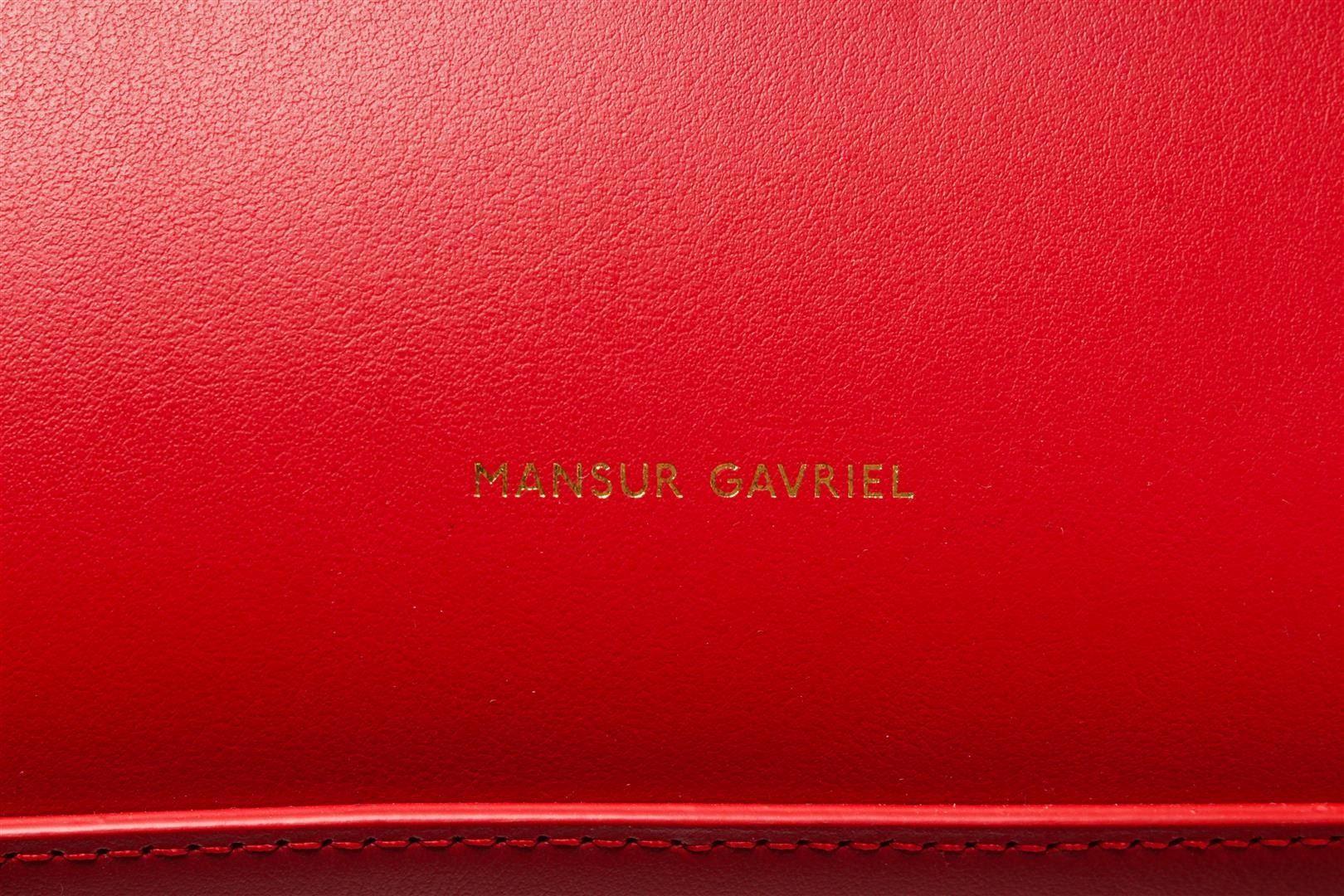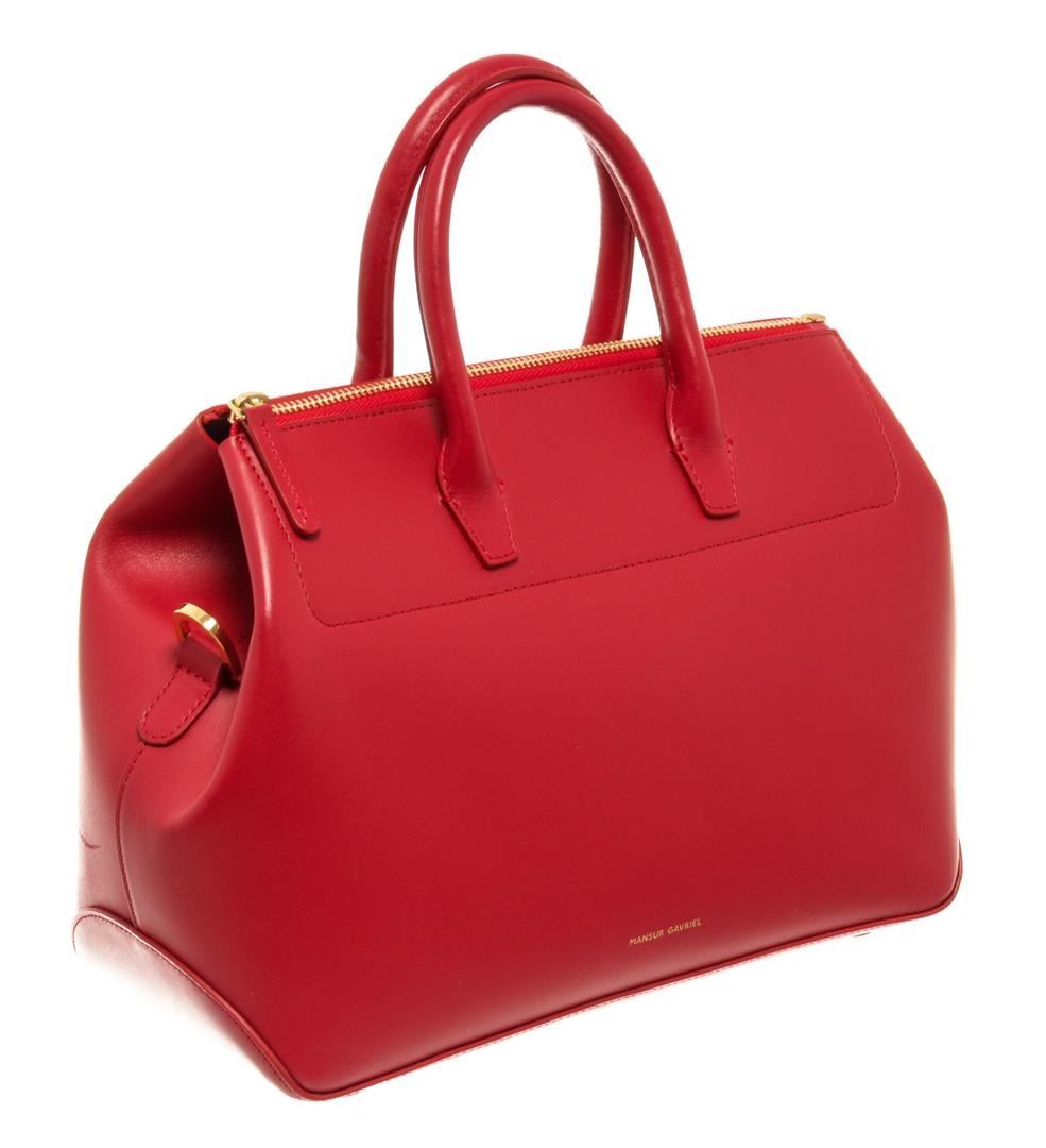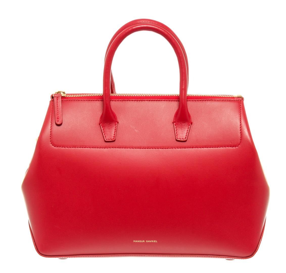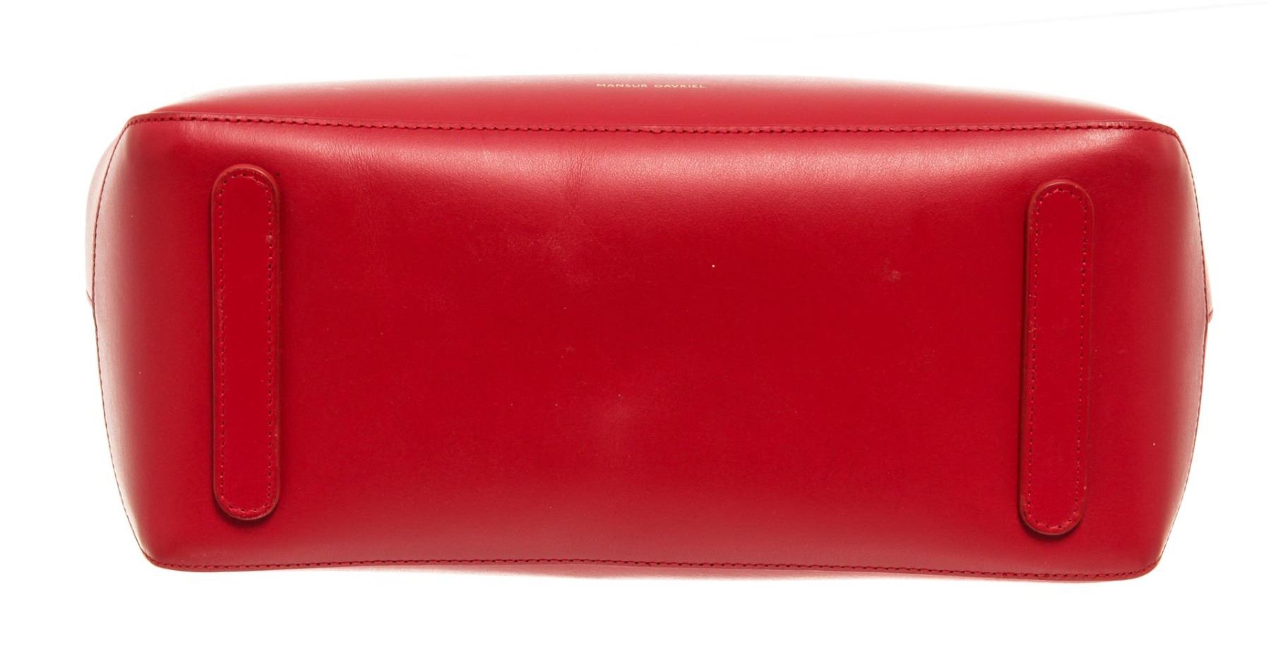 One Mansur Gavriel Red Leather Travel Handbag. Item is sold AS-IS. All available information is listed in the description and shown in the photo. Mansur Gavriel Red Leather Travel Handbag. Features gold hardware, red leather interior, red leather straps, and a gold zipper closure.