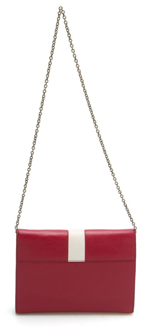 This Marc Jacobs All in One clutch bag features wallet-like qualities with plenty of card slots and a convenient interior mirror. Patent leather with golden hardware. Removable chain shoulder strap; 16 1/2" drop. Fold-over flap; push-lock clasp. Opens to reveal vanity mirror and I.D. slot at interior flap. Leather lining; central zip compartment and sixteen card slots. 7"H x 9"W x 2 1/2"D. Made in Italy. This is a brand new bag.