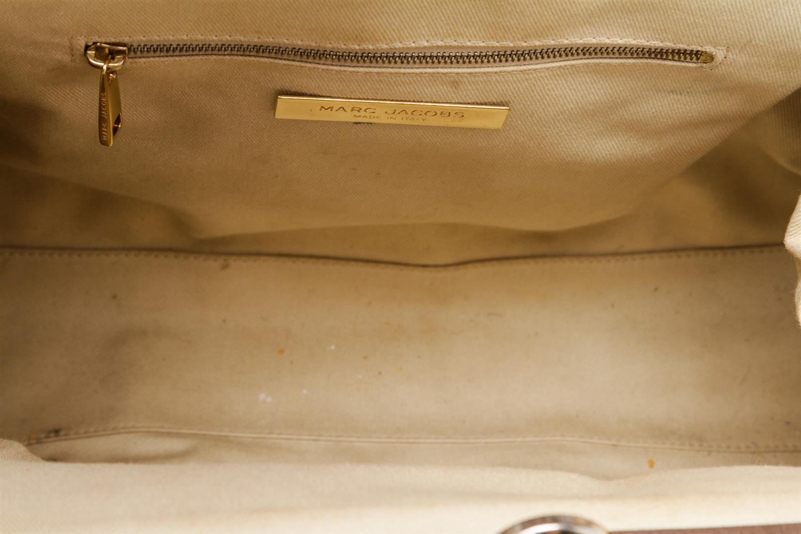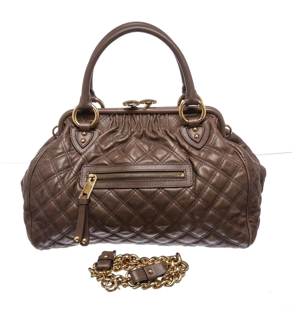 Quilted leather, gold tone hardware, dual rolled handles, detachable chain link shoulder strap and metal twist closure. Interior is beige fabric lined with one side zipper pocket.