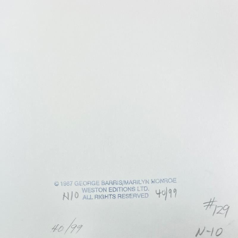 "Marilyn Monroe: The Last Shoot" is a photograph printed from the original negative taken by George Barris (1922-2016). This photo is part of a series entitled "The Last Photos"; they were taken in 1962 just two weeks before Monroe's death and are considered the last photos ever taken of the icon. This framed piece is numbered inverso and hand signed by the photographer. This photo bears the Edward Weston copyright stamp inverso and Includes Letter of Authenticity. Measures approx. 19" x 22" (frame), 11" x 14" (image).