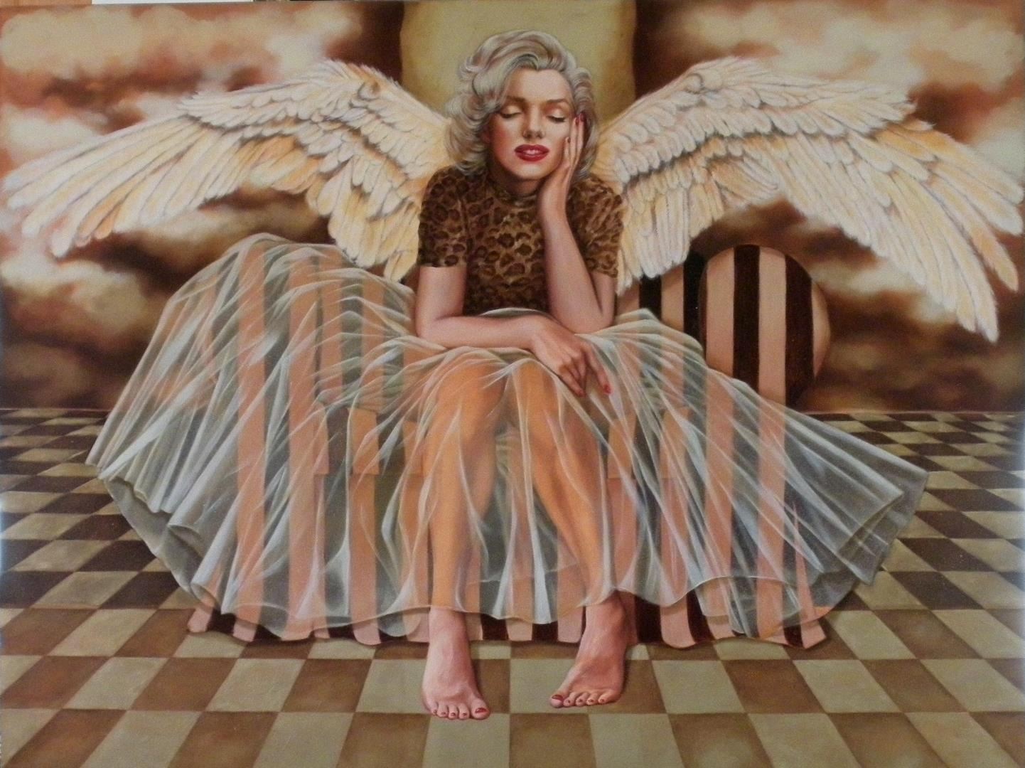 An original 36x48" oil painting of Marilyn Monroe as an angel, by Margarert Korona; on stretched canvas , with signature & COA by artist