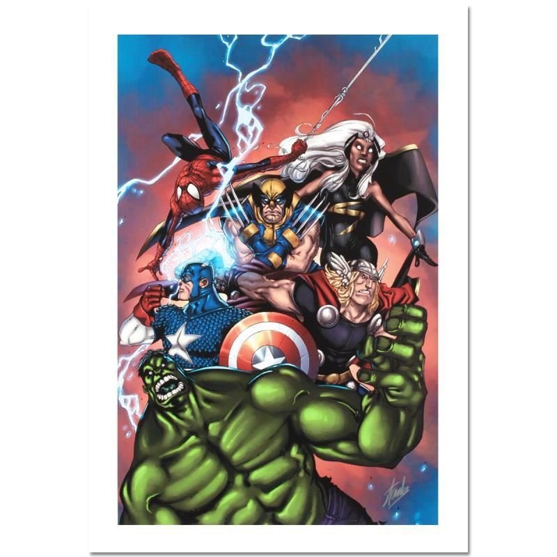 Marvel Adventures: The Avengers #36 is a limited edition giclee on canvas with art by Ig Guara. Officially licensed by Marvel, this piece is numbered 10/10 and hand signed by creative legend Stan Lee (1922-2018). The piece comes with a certificate of authenticity. Measures approximately 27 x 18.