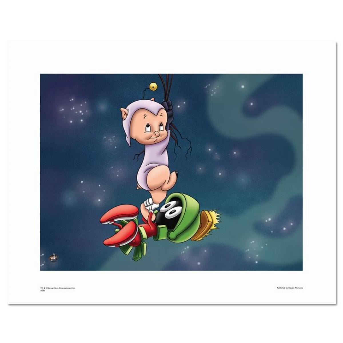 "Marvin and Porky" is a limited edition giclee on paper from Warner Bros. featuring the Looney Tunes characters Marvin Martian and Porky Pig (as The Eager Young Space Cadet). It comes numbered, with hologram seal, and a Certificate of Authenticity! Measures approx. 16 x 20" (with border), 12" x 16" (image).
