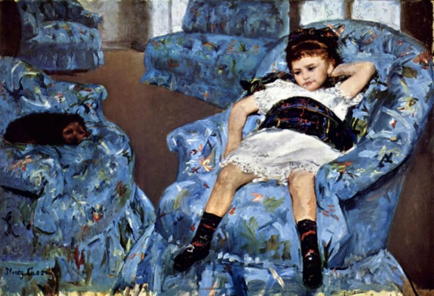 Artist: Mary Stevenson Cassatt (b. 1844 - 1926) Title: Small Girl In The Blue Armchair Medium: Fine Art Reproduction Giclee on Canvas Image Size: Approximately 21.75 inches x 32 inches Unframed on Unstretched Canvas Birography: Born on May 22, 1844, in Allegheny City, Pennsylvania, Mary Cassatt was one of the leading artists in the Impressionist movement of the later part of the 1800s. Moving to Paris, her home for the rest of her life, she was befriended by Edgar Degas. After 1910, her increasingly poor eyesight virtually put an end to her serious painting, and she died in 1926.