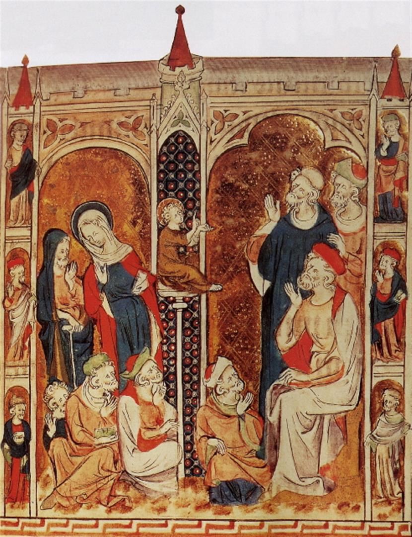 Artist: Mary Psalter - Title: Twelve year old Christ in the temple - Medium: Fine Art Giclee on Canvas - Image Size: Approximately 32 inches x 24.5 inches - Unframed on Unstretched Canvas - Biography: The Queen Mary Psalter is a fourteenth-century English psalter named after Mary I of England, who gained possession of it in 1553. The psalter is noted for its beauty and the lavishness of its illustration, and has been called "one of the most extensively illustrated psalters ever produced in Western Europe" and "one of the choicest treasures of the magnificent collection of illuminated MSS. in the British Museum".The psalter was perhaps produced c. 1310-1320 by one main scribe and, unusually for a work so heavily illuminated, a single artist,who is now known as the "Queen Mary Master". It was probably made in London, and possibly for Isabella of France, queen of Edward II of England, though there is no agreement on the matter.