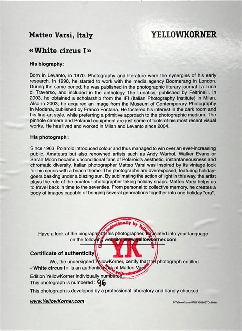 Matteo Varsi Italy White Circus I YellowKorner Certified Photograph. Certificate of Authenticity from YellowKorner affixed to the back. Matted Dimensions 16"x20". Protected with Clear Mylar Sleeve.