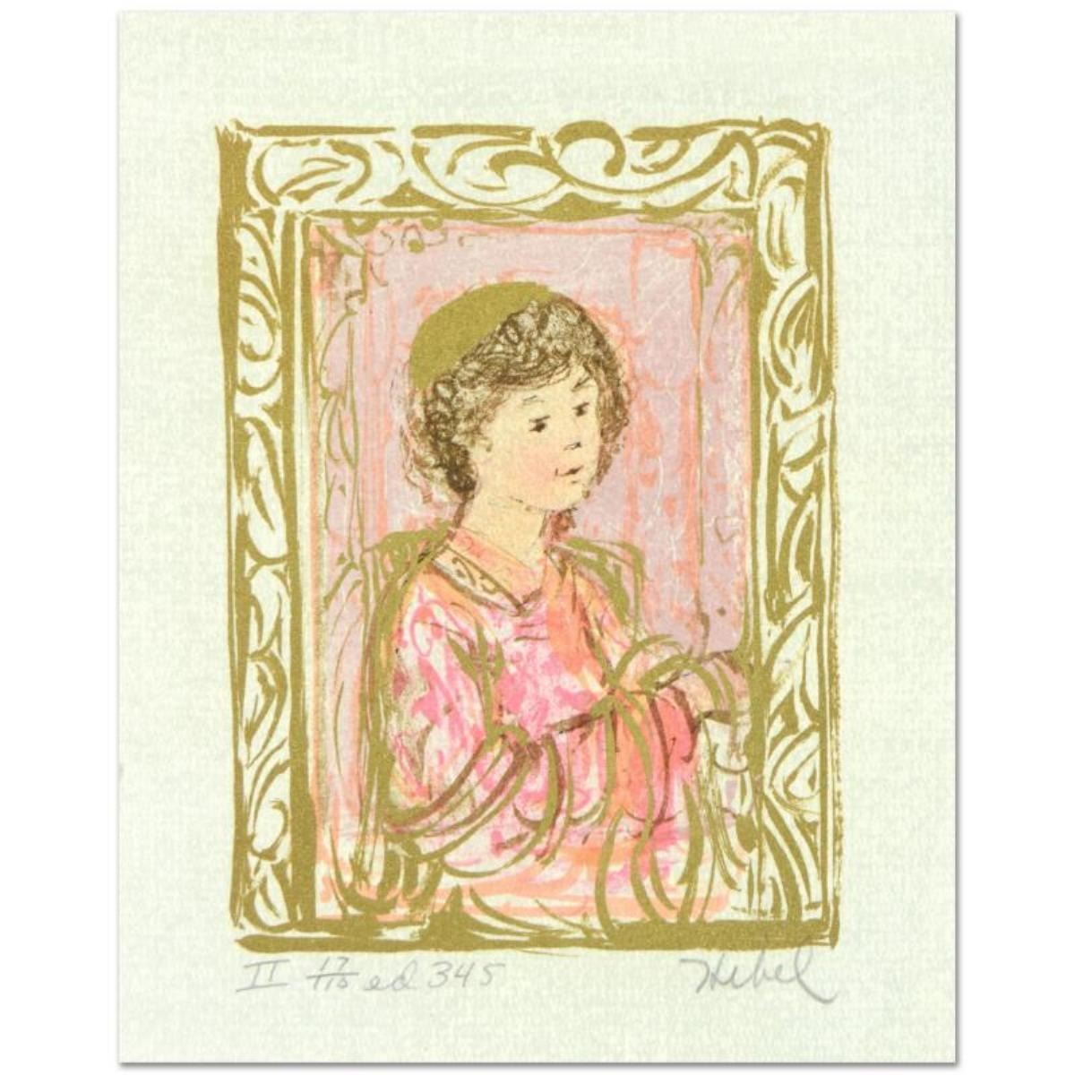 "Meditation" is a limited edition lithograph on paper with remarque by Edna Hibel (1917-2014), numbered and hand signed by the artist. Includes Certificate of Authenticity. Measures approx. 5.5" x 6.5" (border), 4" x 5" (image).