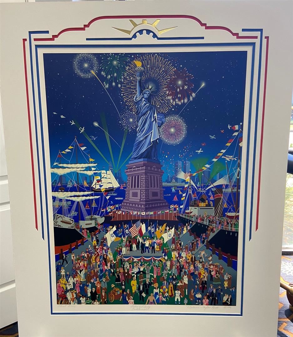 One of the most successful artists of the animation movement, Melanie Taylor Kent's 40x32" matted serigra[ph Commemorates the 100th Anniversary of the Statue of Liberty. Matted but not framed.