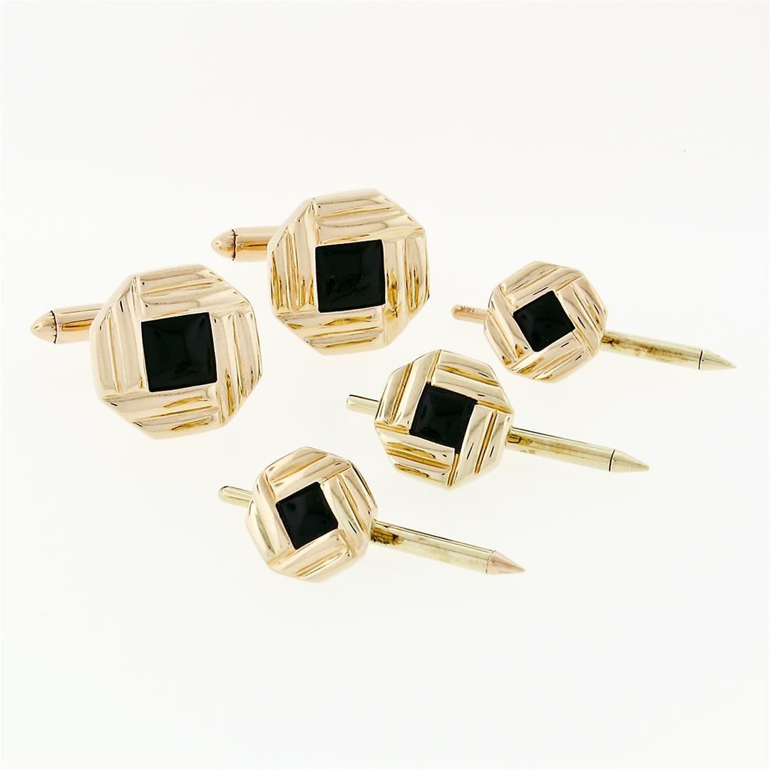 A solid 14k yellow gold cufflinks and button stud set. with 5 square cabochon cut natural black onyx (6.7mm & 4.5mm). These cuff links have a swivel design with a clearance of 12.4mm, weigh a total of 20.12 grams, and the front panels measure 16.4mm & the button studs dimensions11.8mm