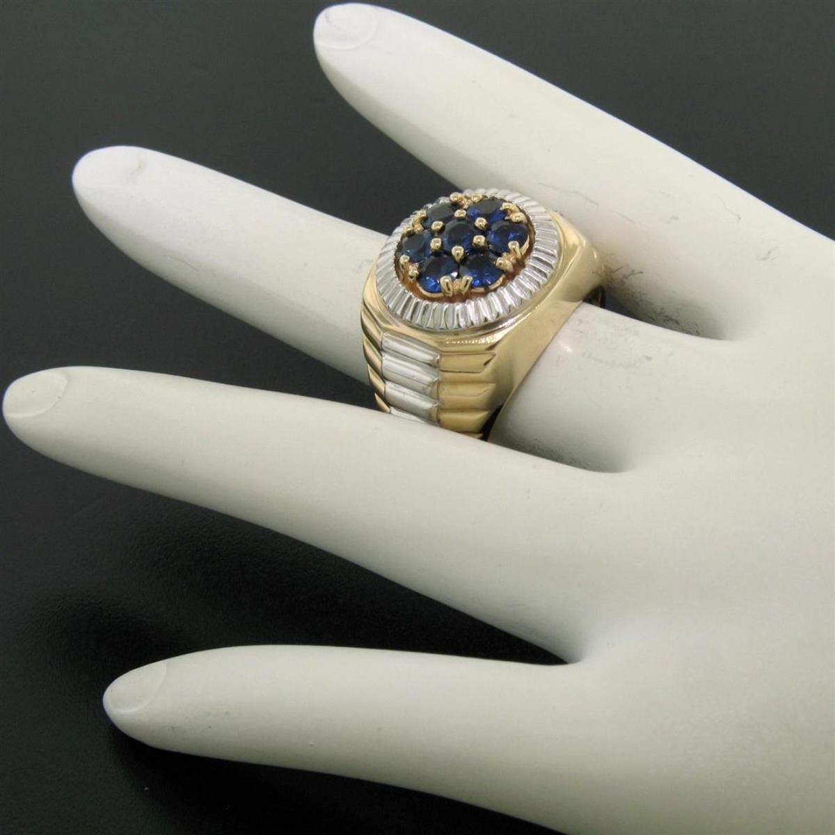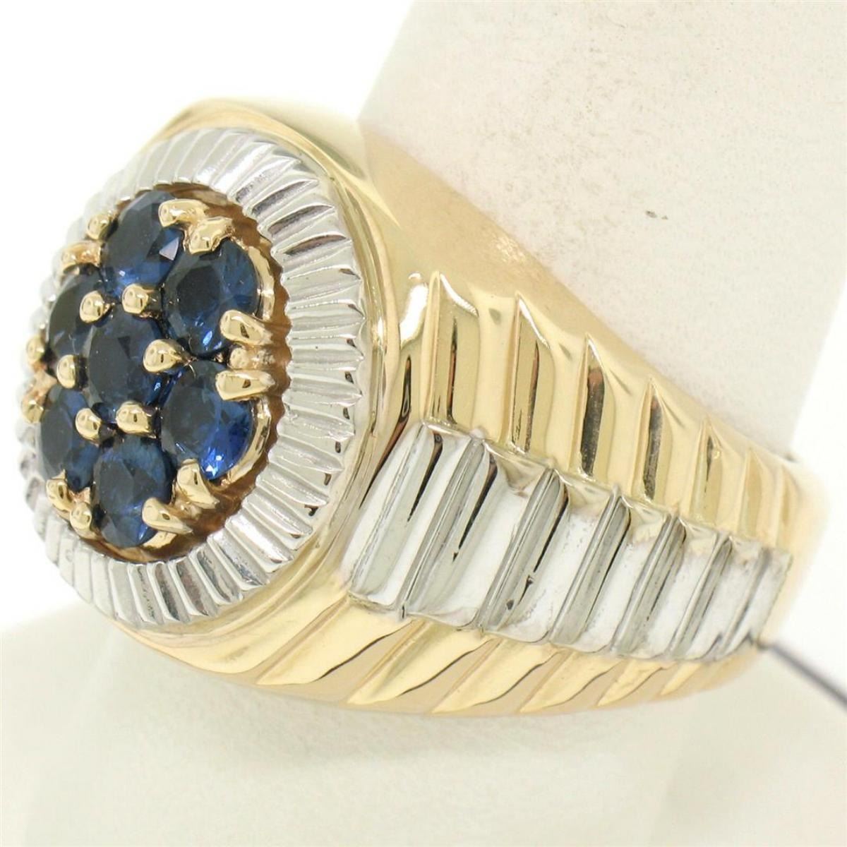 One QUALITY Men's 14k Two Tone Gold 2.50 ctw Round Sapphire Cluster Ribbed Band Ring. Item Details: Material: 14K Solid Yellow and White Gold, Weight: 21.01 Grams, Stone(s): (7) Natural Genuine Sapphires - Round Brilliant Cut - Prong Set - Rich Royal Blue Color, Total Carat Weight: 2.50 (approx.), Ring Size: 9.0, Ring Width: 18.40mm, Ring Height: 8.67mm rise off the finger, Condition: Like New!
