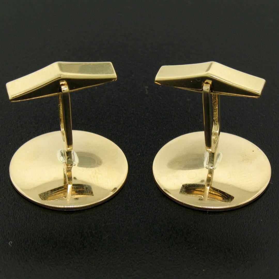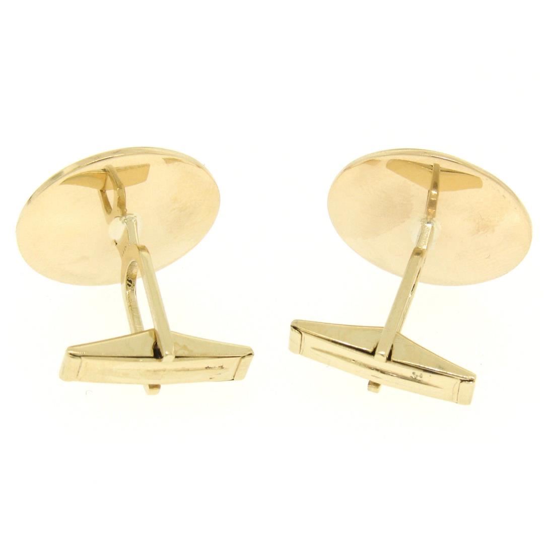 An estate 14k yellow gold concave swirl cufflinks, These cuff links have a swivel design with a clearance of 14.50mm, weigh a total of 11.1 grams, and the front panels measure 19.92mm in diameter.