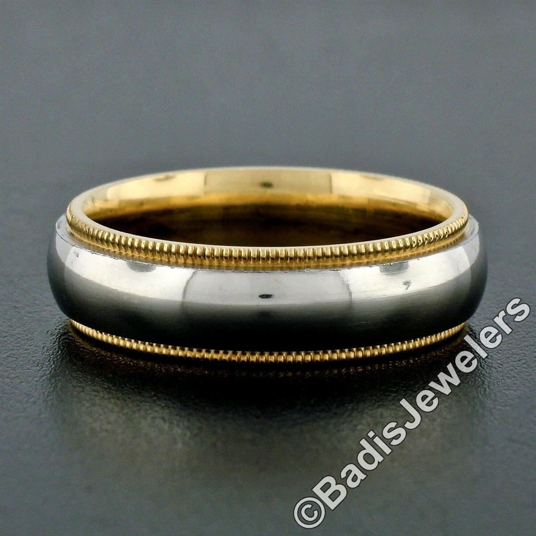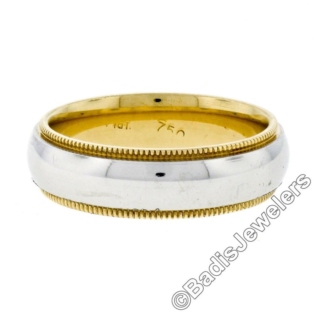 An 18kt white and yellow gold men's wedding band ring with a domed center and milgrain etched edges. The ring is size 6.5, weighs a total of 8.47 grams, and measures 5.5mm wide.