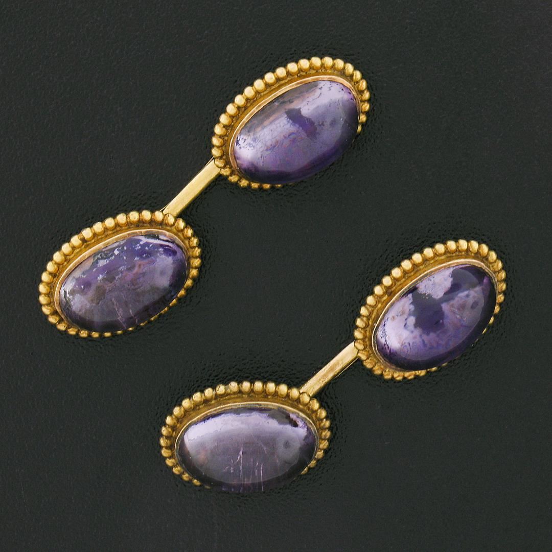 An antique solid 14k yellow gold cufflinks, with 4 oval cabochon cut natural amethysts (10.3x7mm each). These cuff links have a chain design with a clearance of 19mm, weigh a total of 6.04 grams, and the front panels measure 12.9x9.75mm.