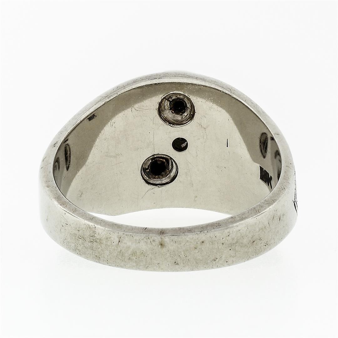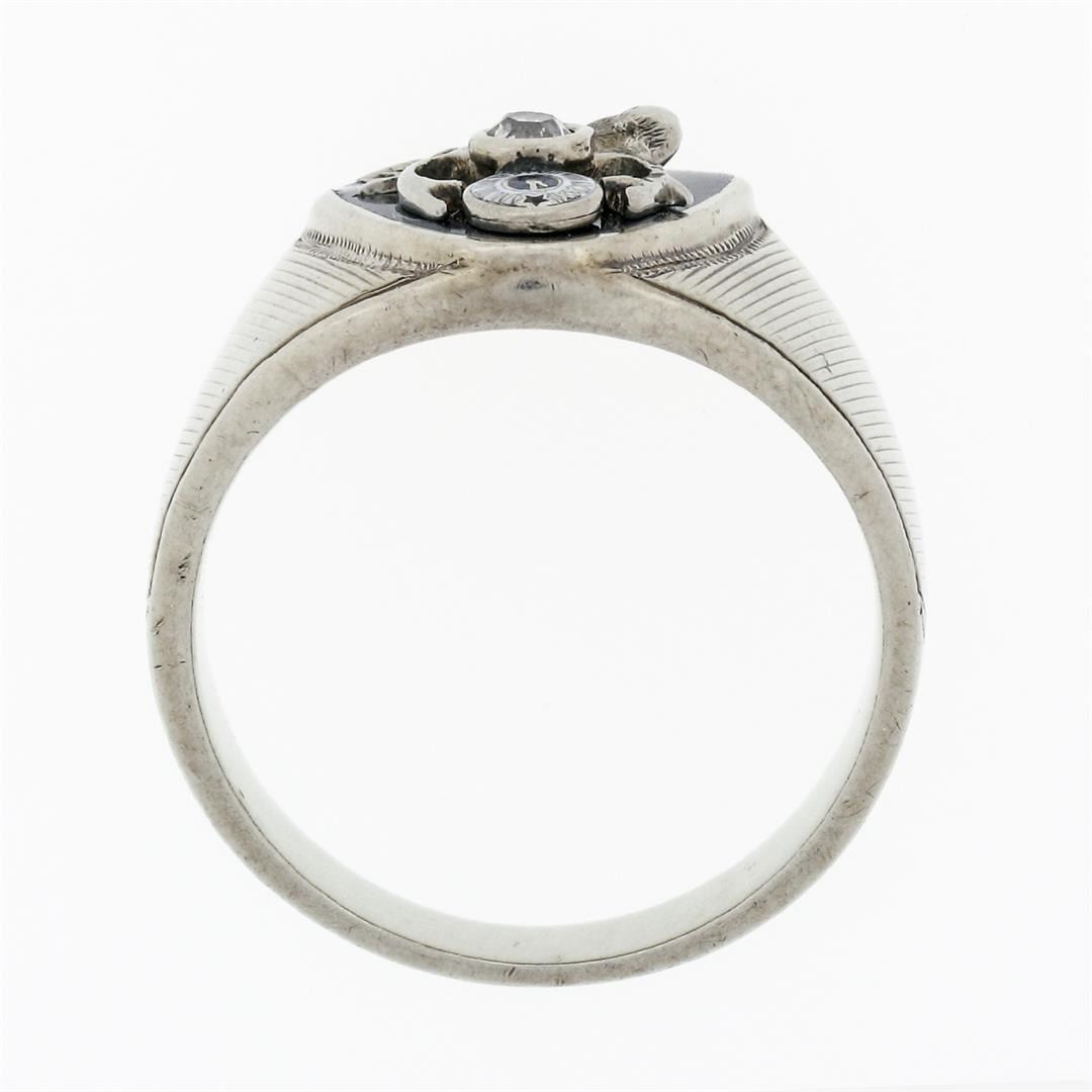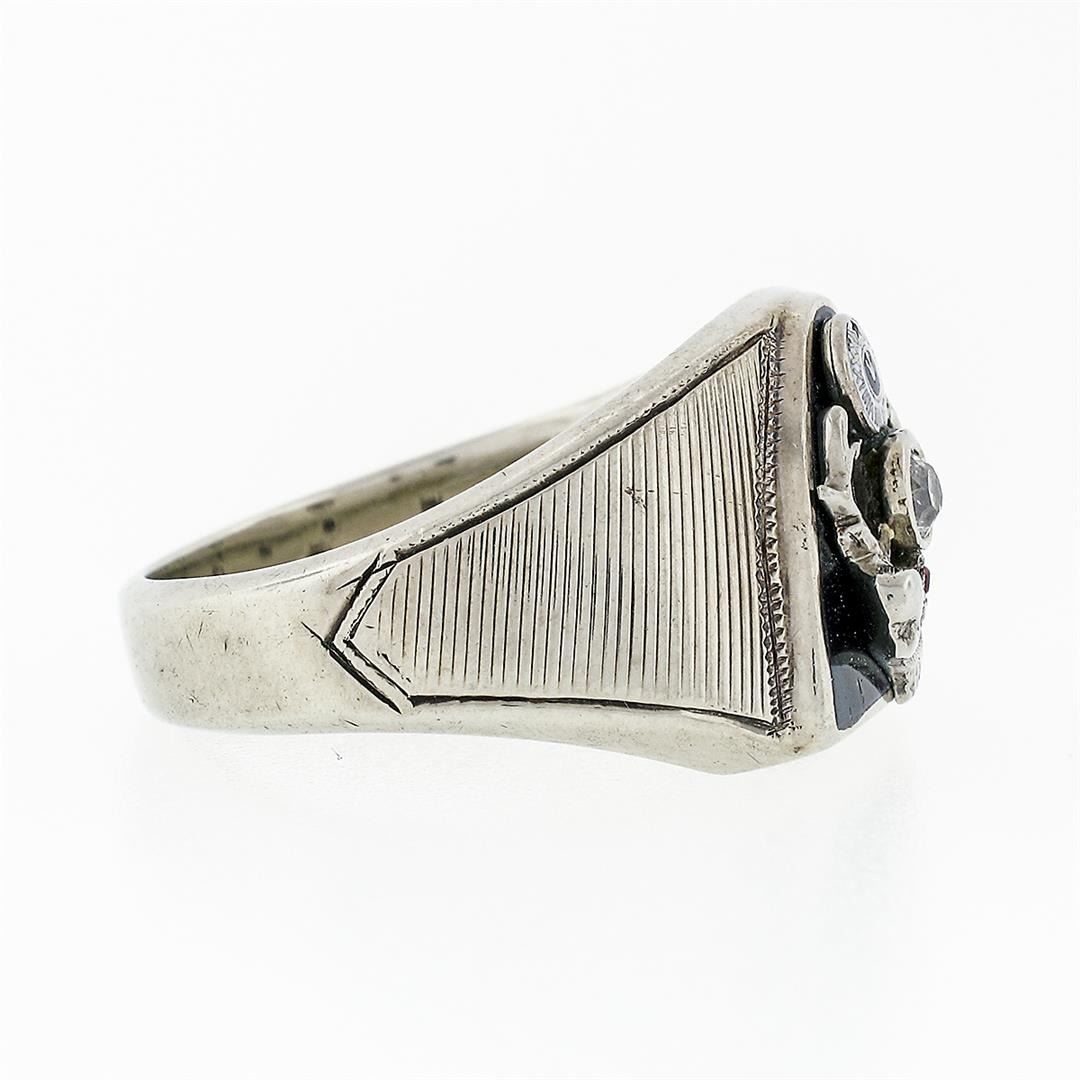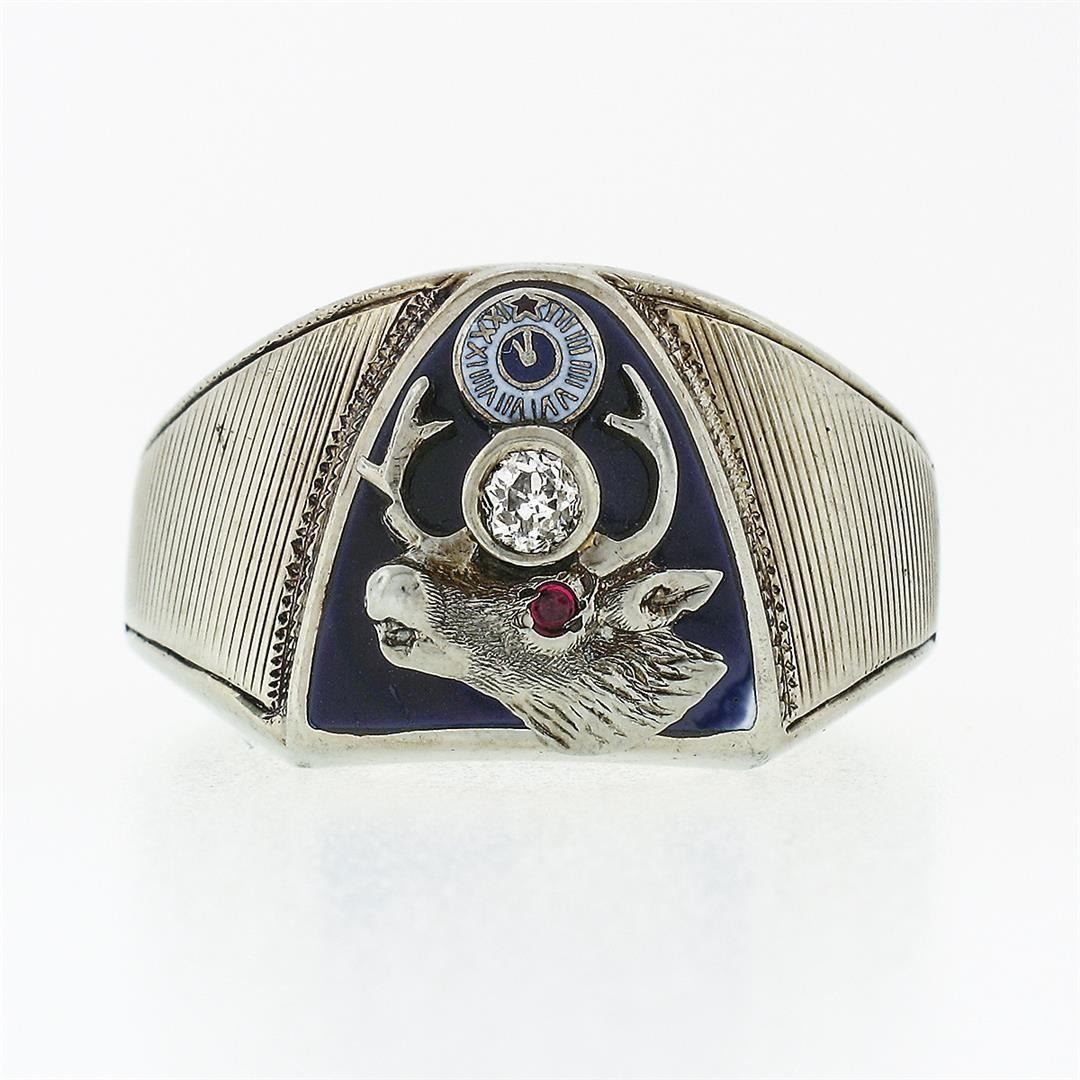 An antique solid 14k white gold elk moose ring, with enamel work & 1 old mine cut natural diamond (H- SI1; 0.14ct), & round cut natural ruby (0.03ct ). The ring is size 9.5, weighs a total of 12.02 grams, and measures 13.34mm wide.