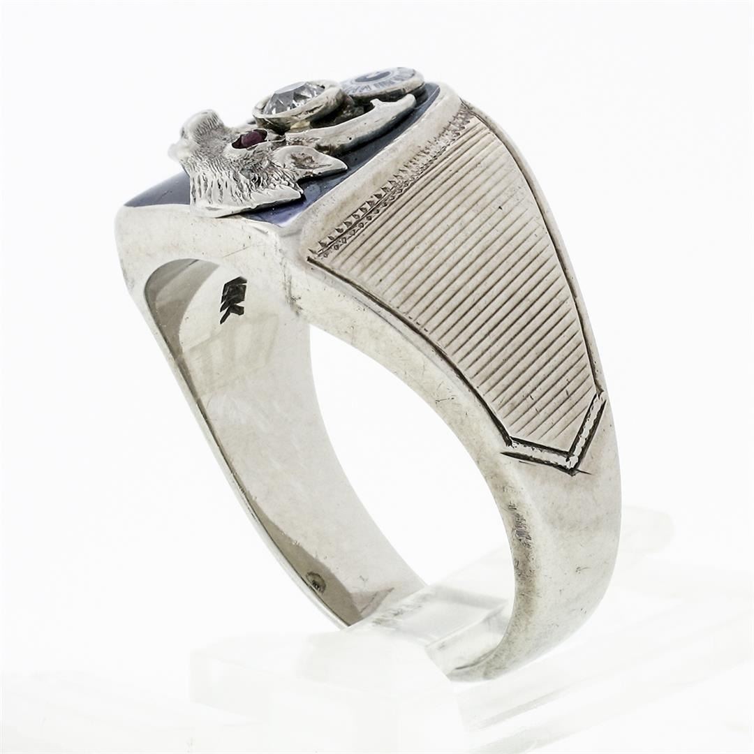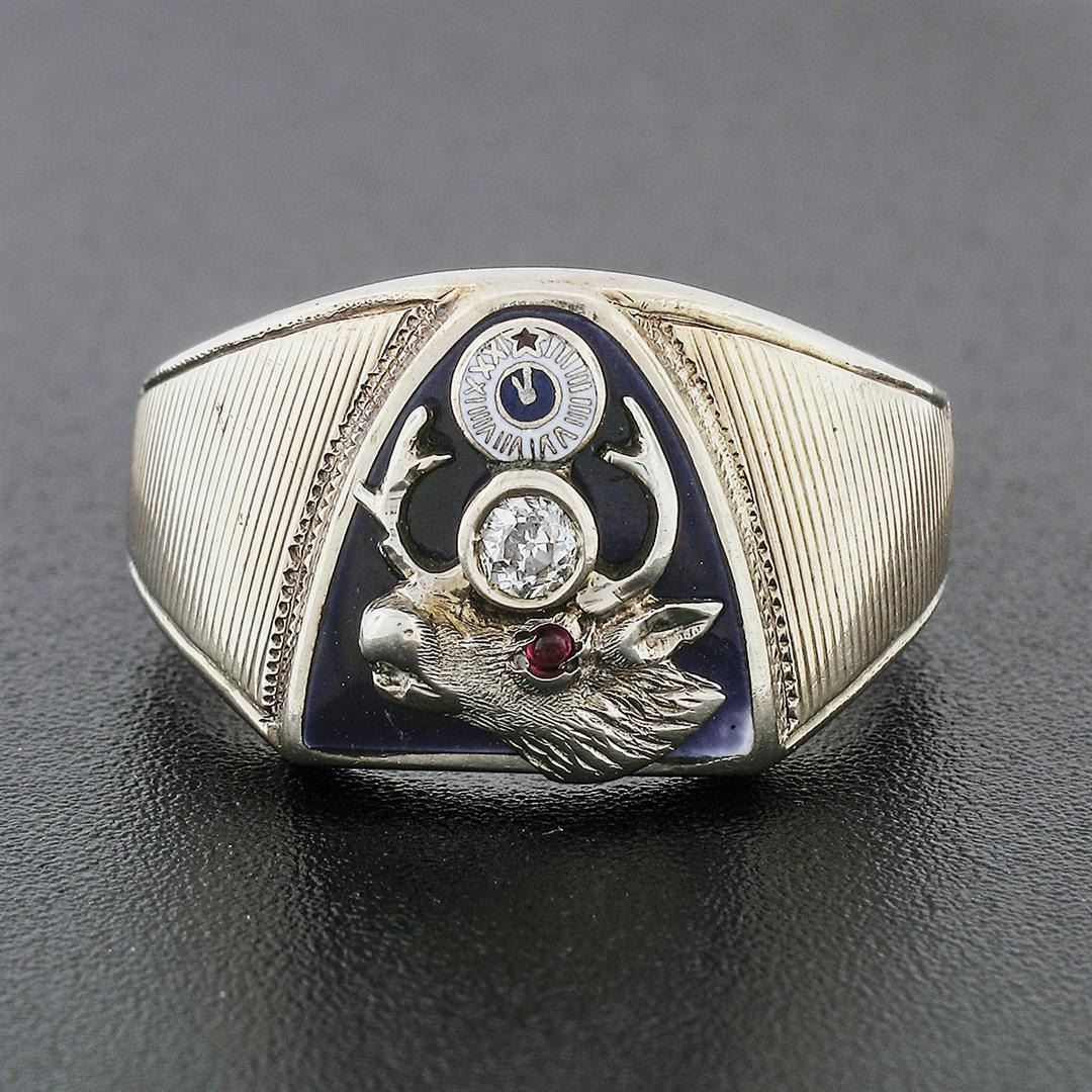 An antique solid 14k white gold elk moose ring, with enamel work & 1 old mine cut natural diamond (H- SI1; 0.14ct), & round cut natural ruby (0.03ct ). The ring is size 9.5, weighs a total of 12.02 grams, and measures 13.34mm wide.