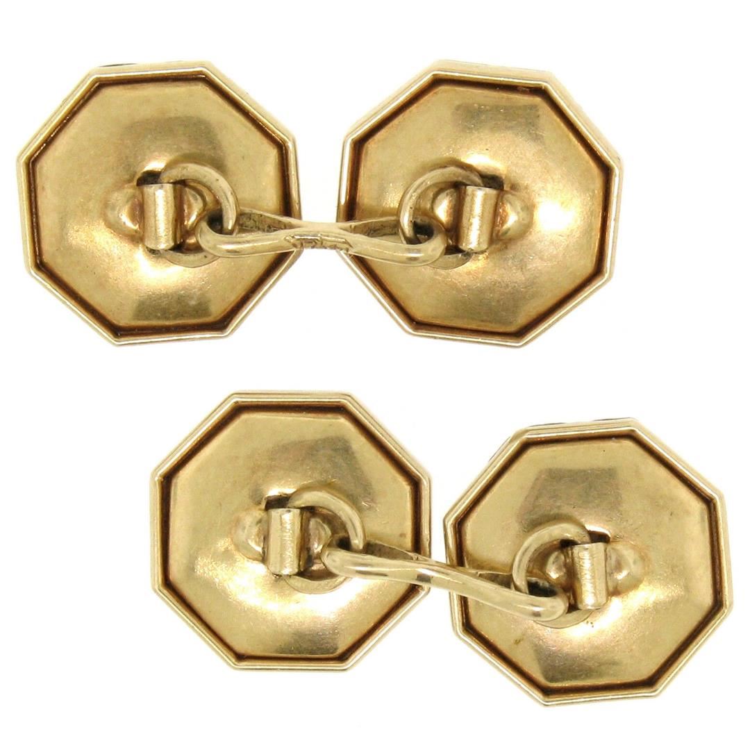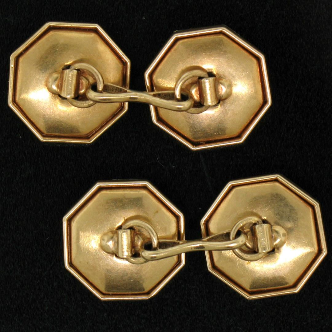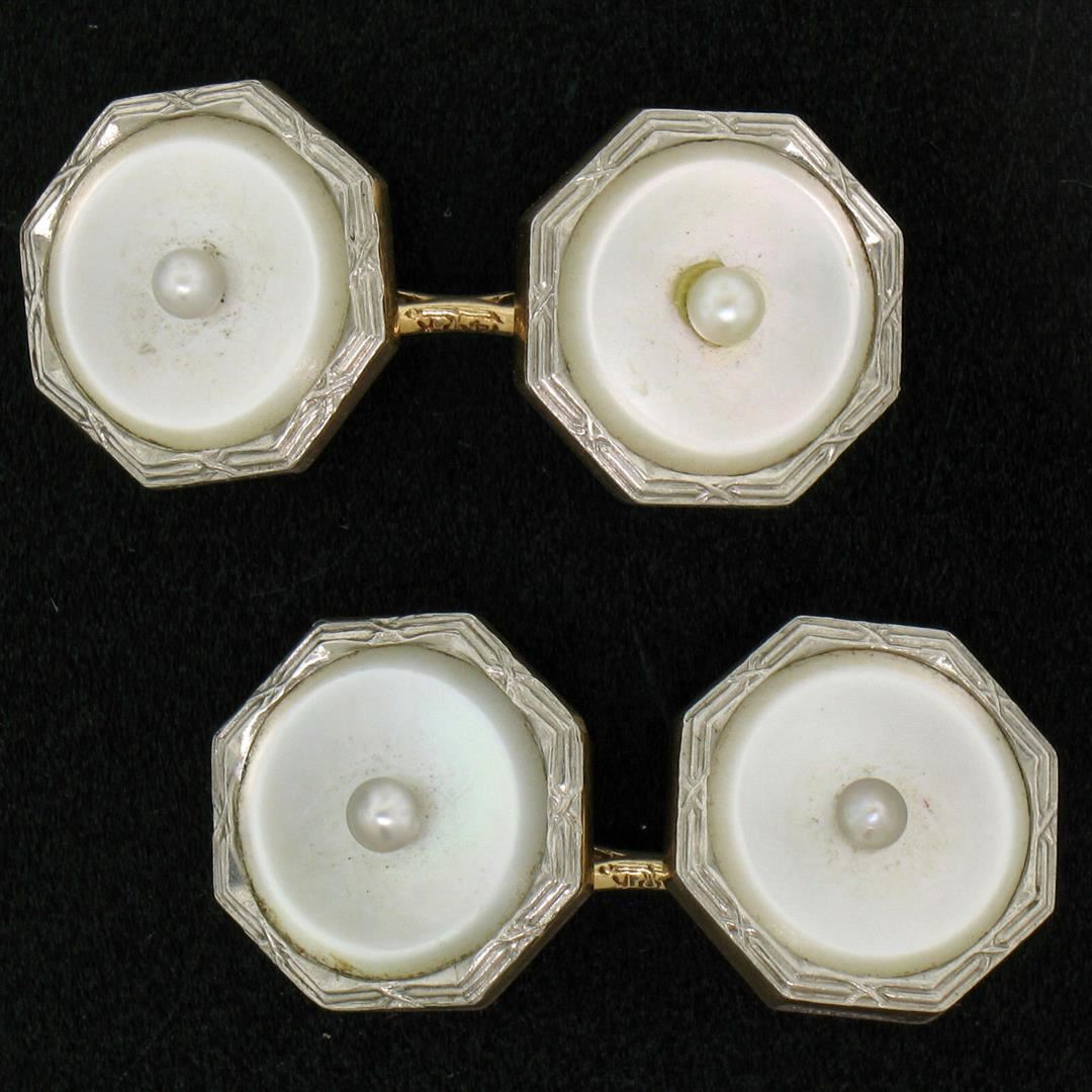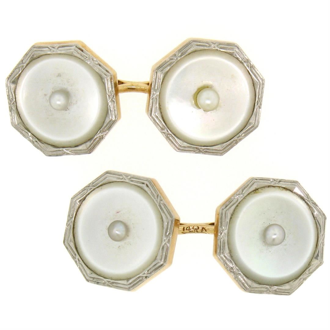 One Men's Antique Art Deco Etched 14k Gold & Mother of Pearl Seed Octagon Cuff Links. Item Details: Material: Solid 14k Yellow Gold w/ White Gold Top, Total Weight: 6.2 Grams, Overall Diameter: 13.45mm, Cuff Clearance: 15.20mm, Condition: Antique, Art Deco - Original patina has been preserved - Excellent, ready to wear condition!