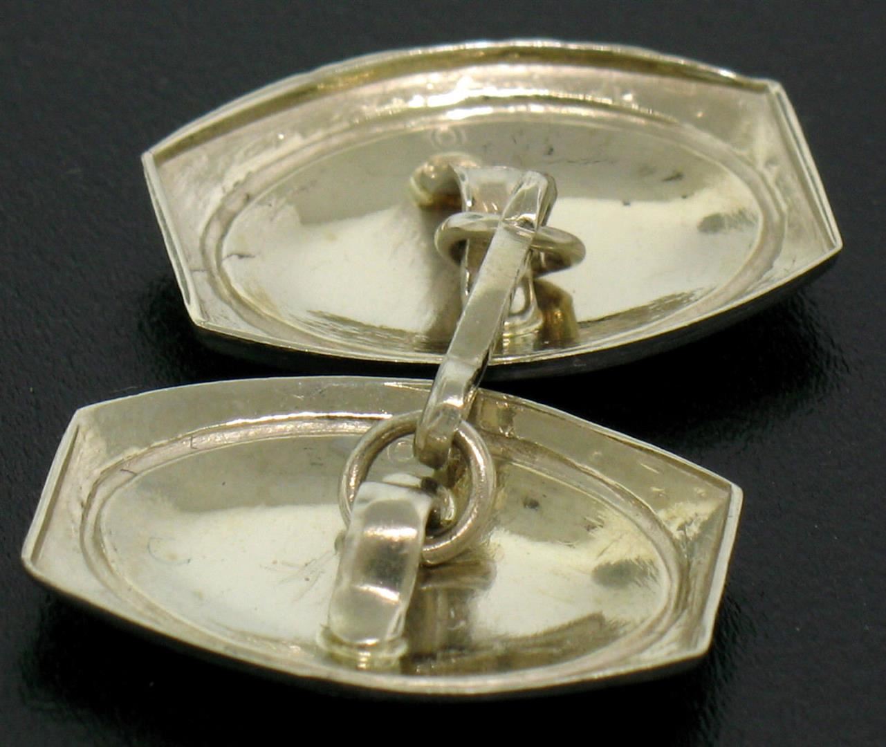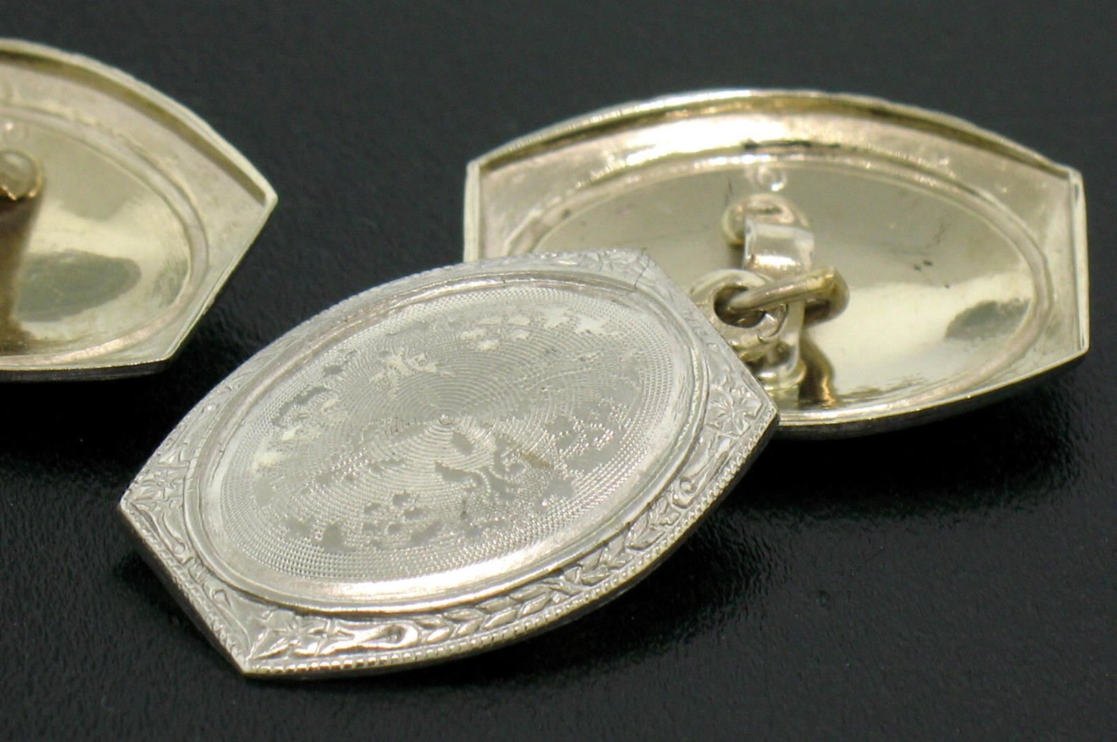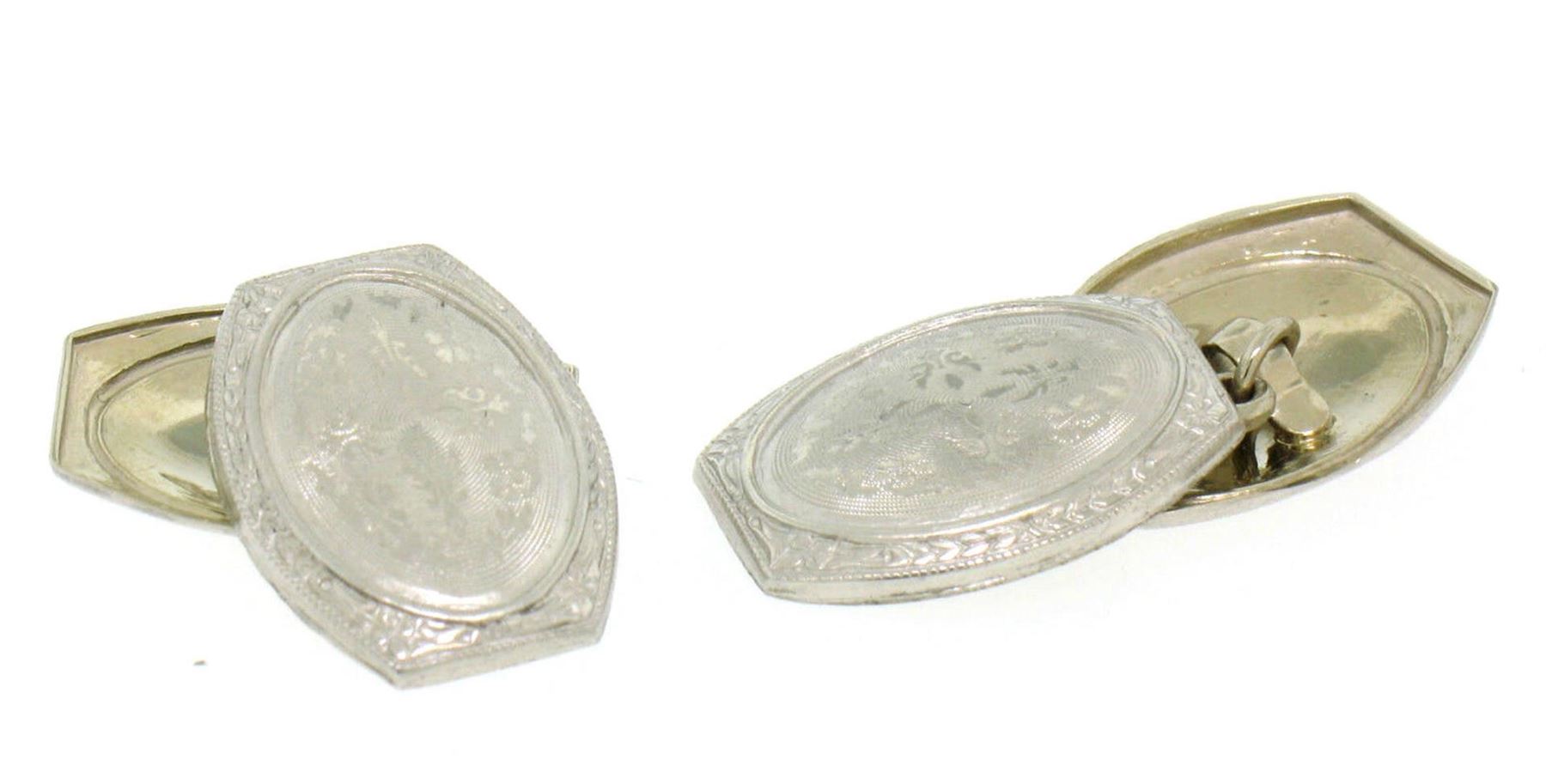 An antique solid 14k white gold damask etched oval panel Cufflinks, These cuff links have a linking bar design, weigh a total of 4.0 grams, and the front panels measure 12.28x16.72mm.
