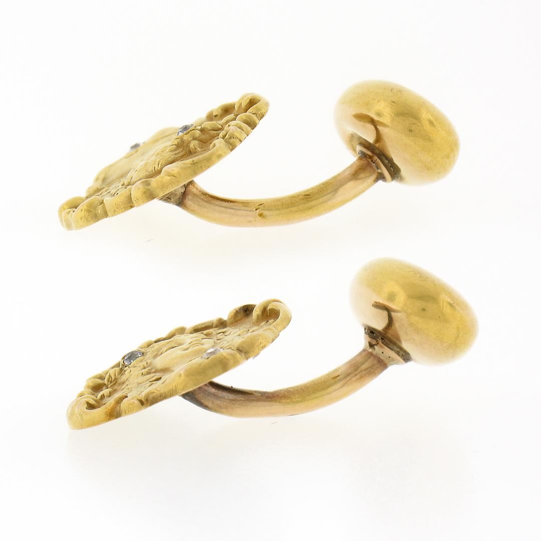 An antique solid 14k yellow gold men's cufflinks, featuring 4 old single cut natural diamonds (G/H - VS2/SI1 ; 0.04ctw). These cuff links have a fixed back design with a clearance of 7mm, weigh a total of 5.18 grams, and the front panels measure 18.70x14.9mm.
