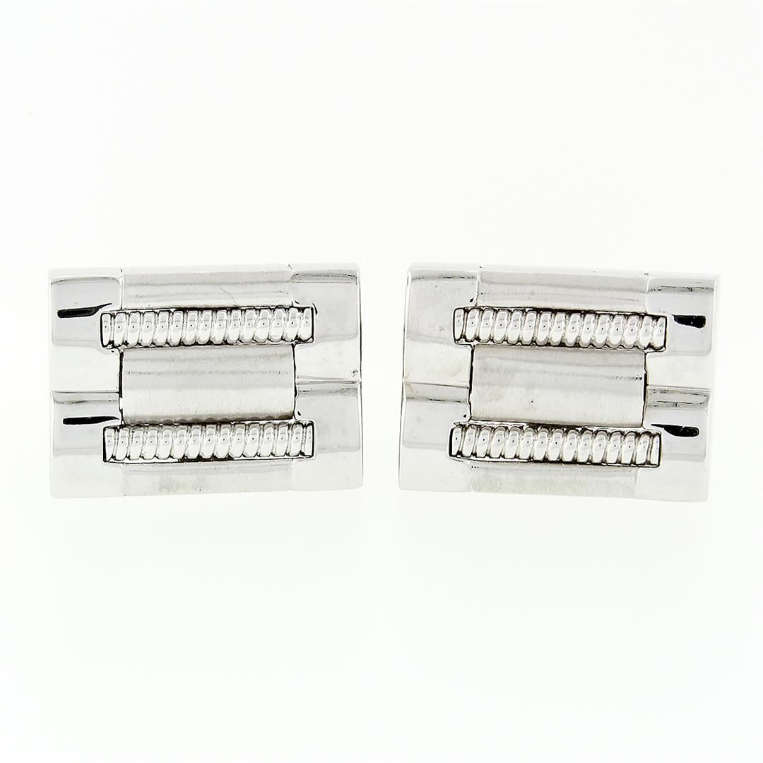 A designer L&M 14k white gold cuuflinks. These cuff links have a swivel design with a clearance of 12.5mm, weigh a total of 14.48 grams, and the front panels measure 15.25x20.97mm.
