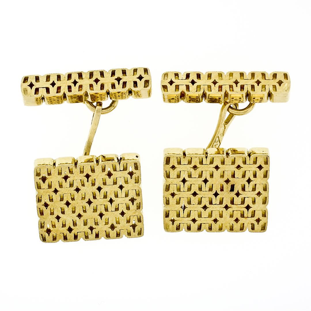 A vintage italain solid 18k yellow gold men's cufflinks. These cuff links have a chain bar design with a clearance of 20.36mm, weigh a total of 14.92 grams, and the front panels measure 15.67x13.41x2.35mm.