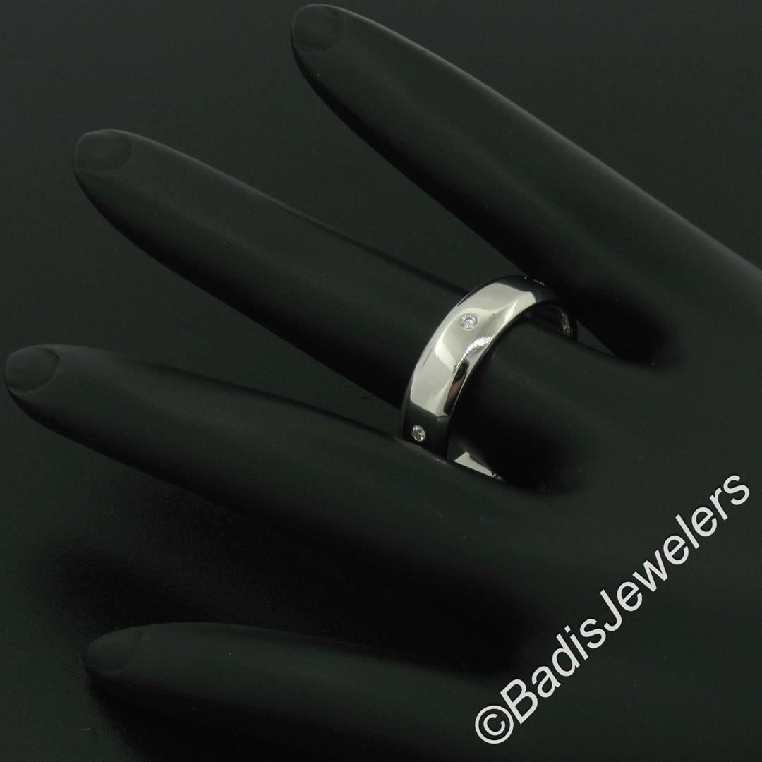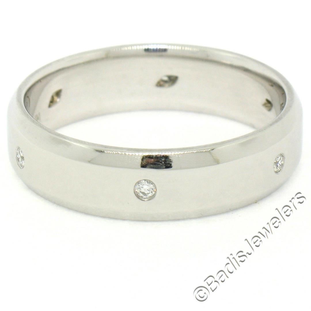 A like new men's platinum beveled band ring by Jeff Cooper burnish set with 0.12ctw of round diamonds. The ring is size 10, weighs a total of 11.7 grams, and measures 5.8mm wide.