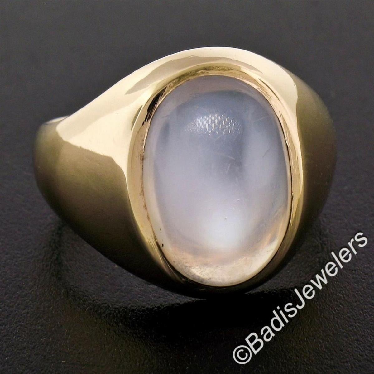 A men's 14kt yellow gold 14.5x10.0mm oval blue moonstone solitaire ring. The ring is size 8.0, weighs a total of 10.27 grams, and measures 17.2mm wide.