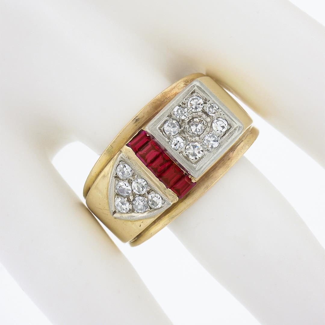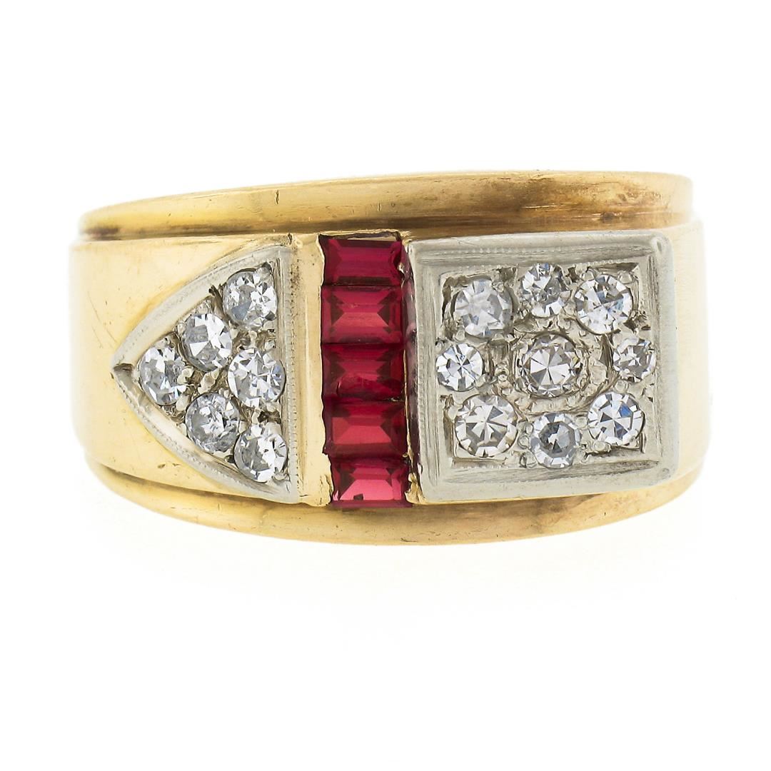 A vintage solid 14k yellow and white gold band ring, with 15 old single cut natural diamonds (G-I - VS2-SI2 ; 0.40ctw), and 5 baguette cut synthetic rubies. The ring is size 12.0, weighs a total of 9.04 grams, and measures 13.55mm wide.