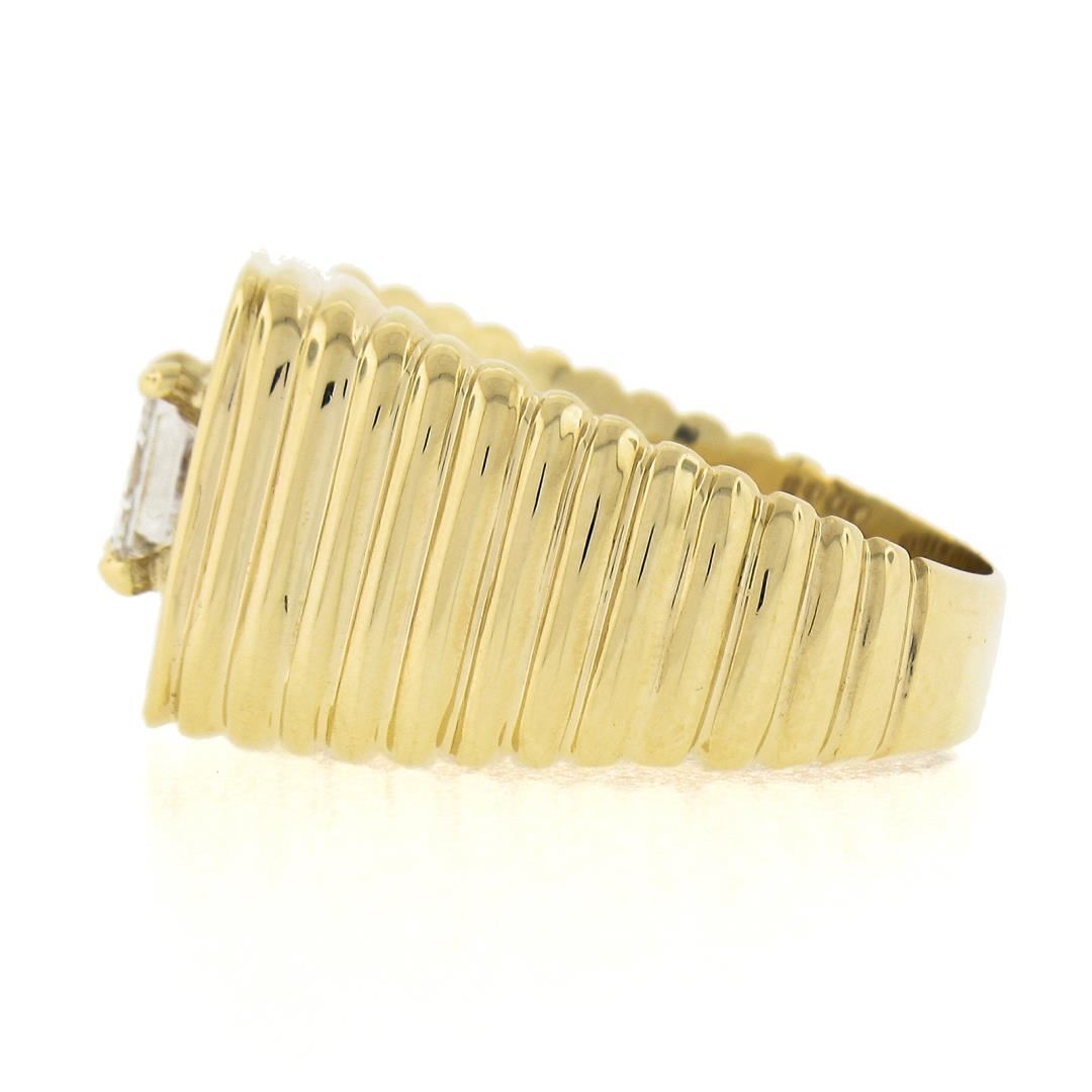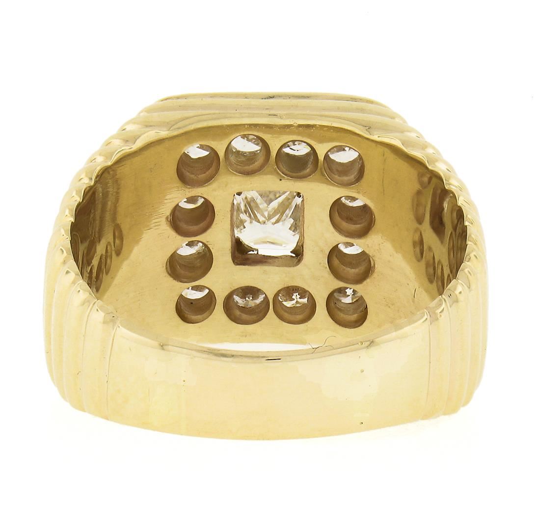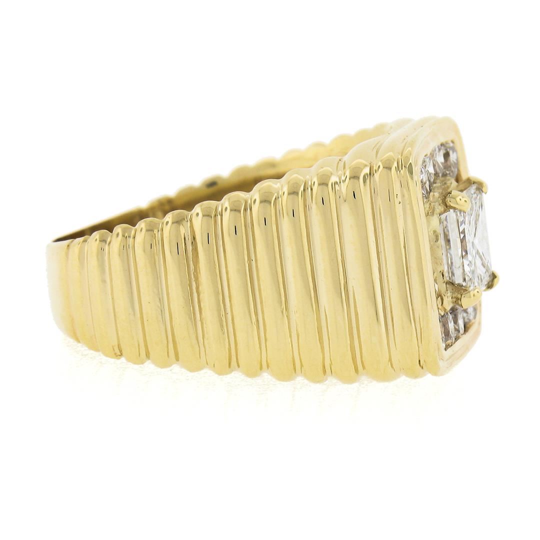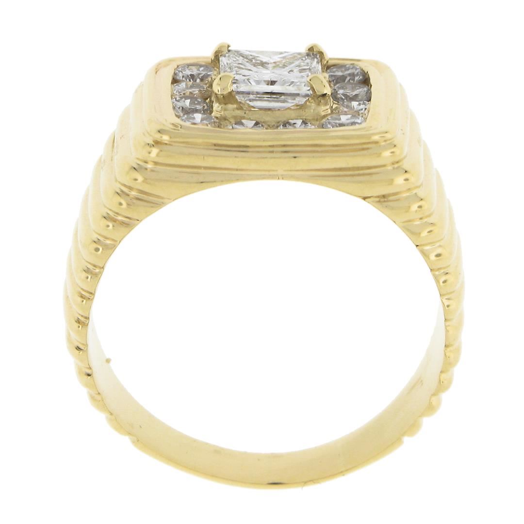 A solid 14k yellow gold ribbed ring, with 1 GIA graded princess cut natural diamond ( G - VS2 ; 1.07ct), surrounded with a halo of 12 round cut natural diamonds (G/H - VS2/SI1 ; 0.84ctw). The ring is size 10.0, weighs a total of 14.40 grams, and measures 13.7mm wide. Comes with all original relevant certifications.