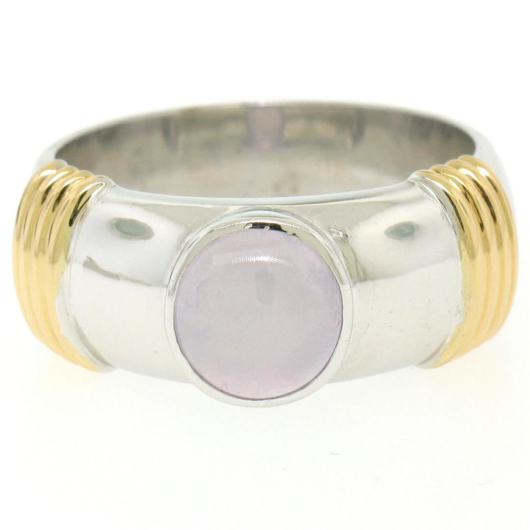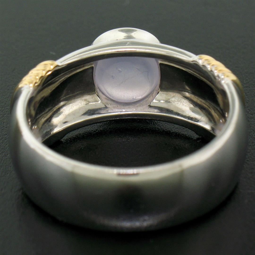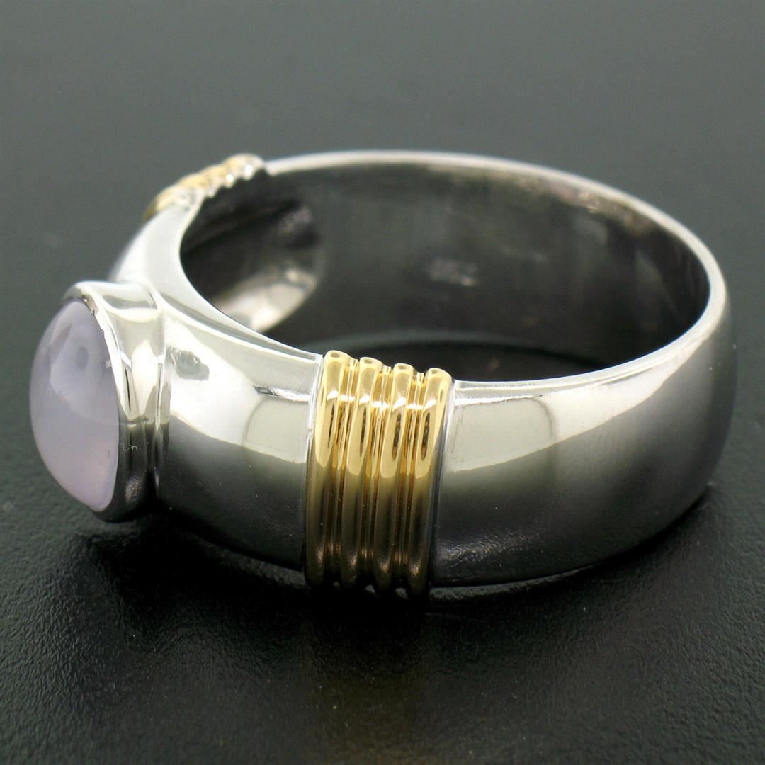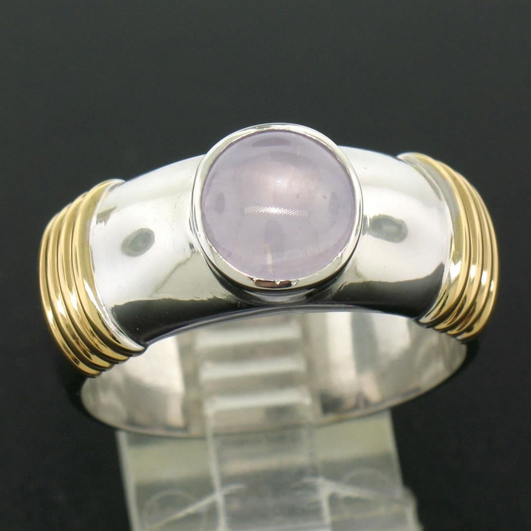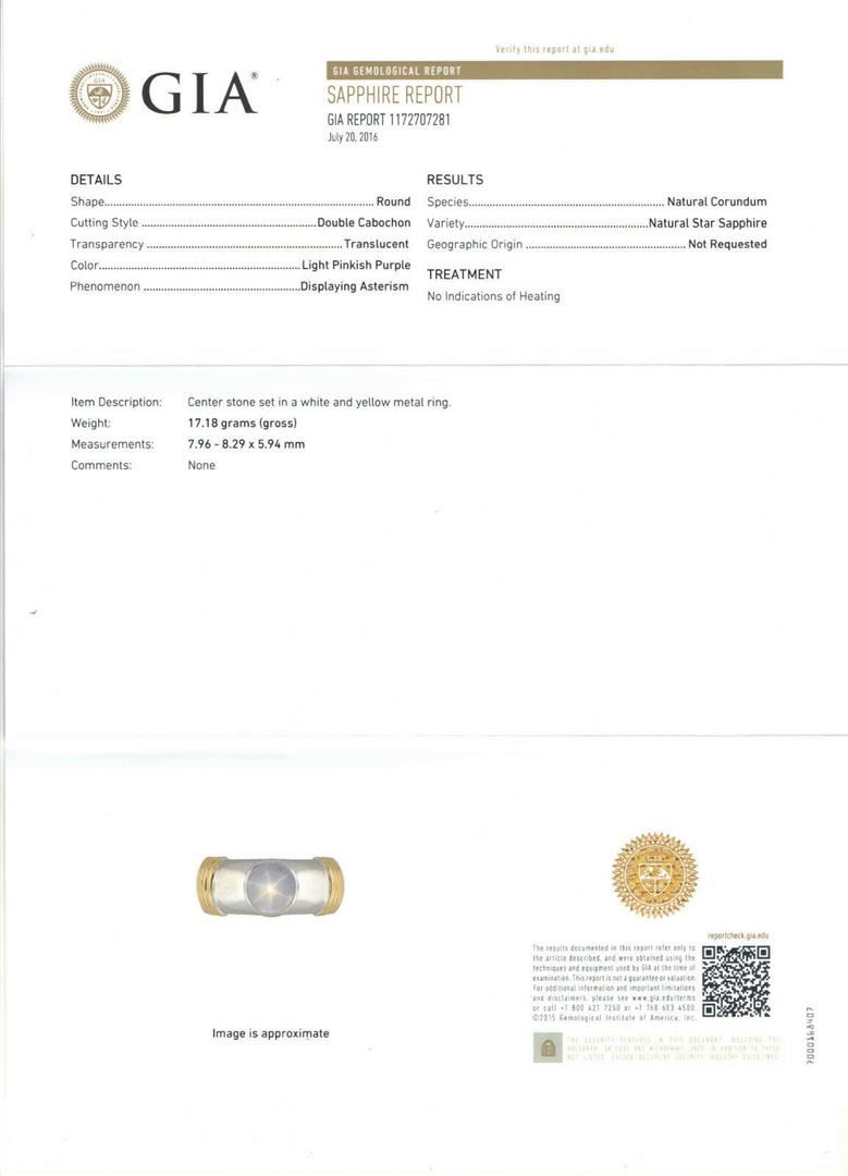 One Men's Ribbed 18k Two Tone Gold GIA Certified Round Star Sapphire Solitaire Ring. Item Details: Material: Solid 18k White and Yellow Gold, Weight: 17.18 Grams, Stone(s): (1) Natural Genuine Star Sapphire - *See Certification Details Below for Complete Info*, Ring Size: 12.0, Ring Width: 10.23mm at the ribbing, Ring Height: 6.87mm rise off the finger, Condition: Like New!, Certification Details Laboratory: GIA Report Number: 1172707281. Stone Type: Natural Star Sapphire, Stone Shape: Round, Cut Style: Double Cabochon, Dimensions: 7.96 - 8.29 x 5.94 mm, Color: Light Pinkish Purple, Transparency: Translucent, Phenomenon: Displays Asterism.