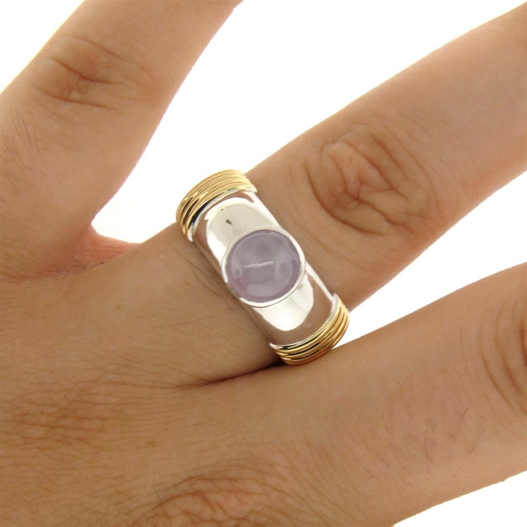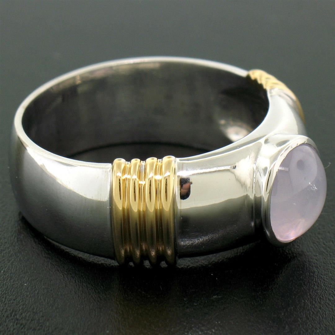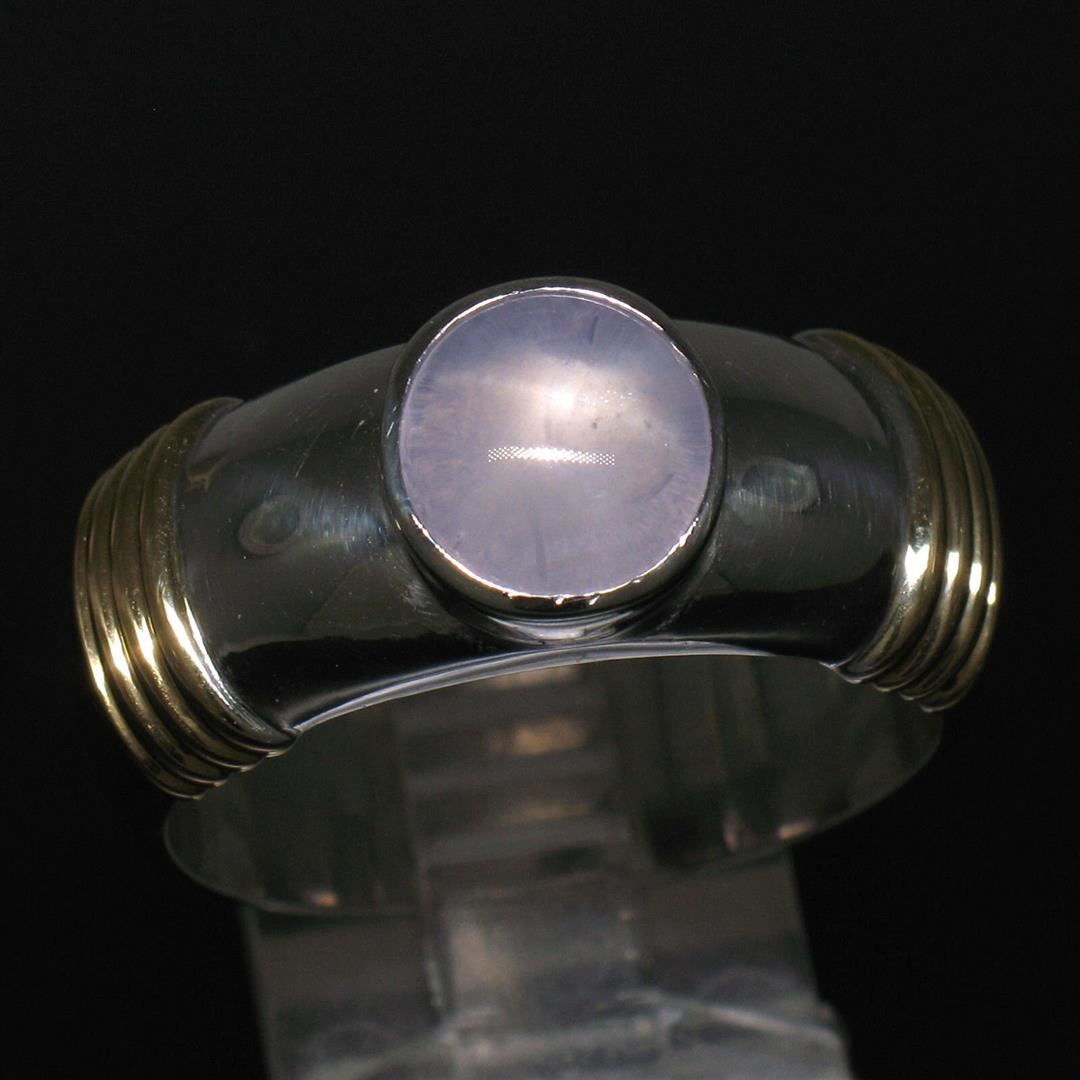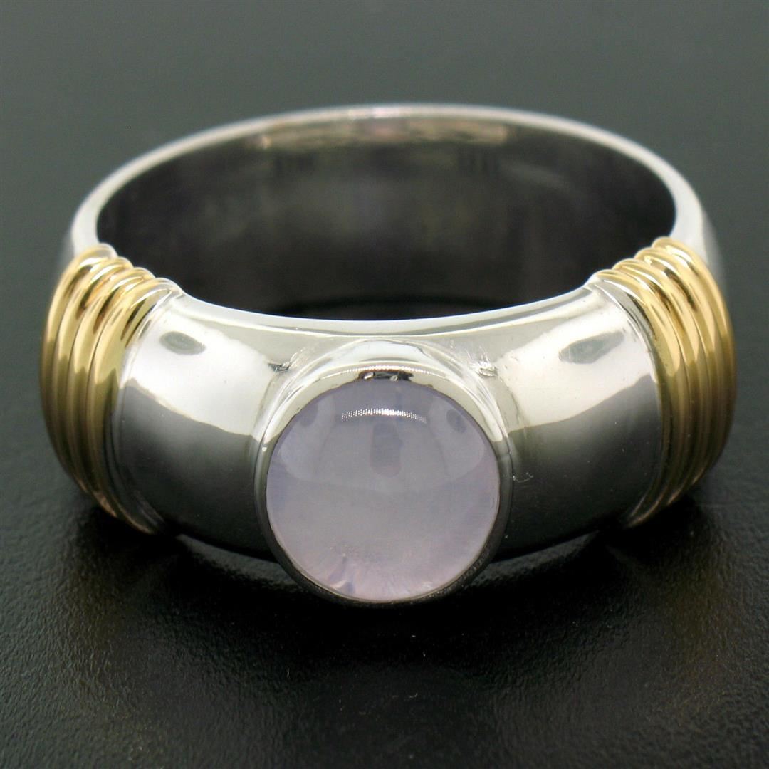 One Men's Ribbed 18k Two Tone Gold GIA Certified Round Star Sapphire Solitaire Ring. Item Details: Material: Solid 18k White and Yellow Gold, Weight: 17.18 Grams, Stone(s): (1) Natural Genuine Star Sapphire - *See Certification Details Below for Complete Info*, Ring Size: 12.0, Ring Width: 10.23mm at the ribbing, Ring Height: 6.87mm rise off the finger, Condition: Like New!, Certification Details Laboratory: GIA Report Number: 1172707281. Stone Type: Natural Star Sapphire, Stone Shape: Round, Cut Style: Double Cabochon, Dimensions: 7.96 - 8.29 x 5.94 mm, Color: Light Pinkish Purple, Transparency: Translucent, Phenomenon: Displays Asterism.