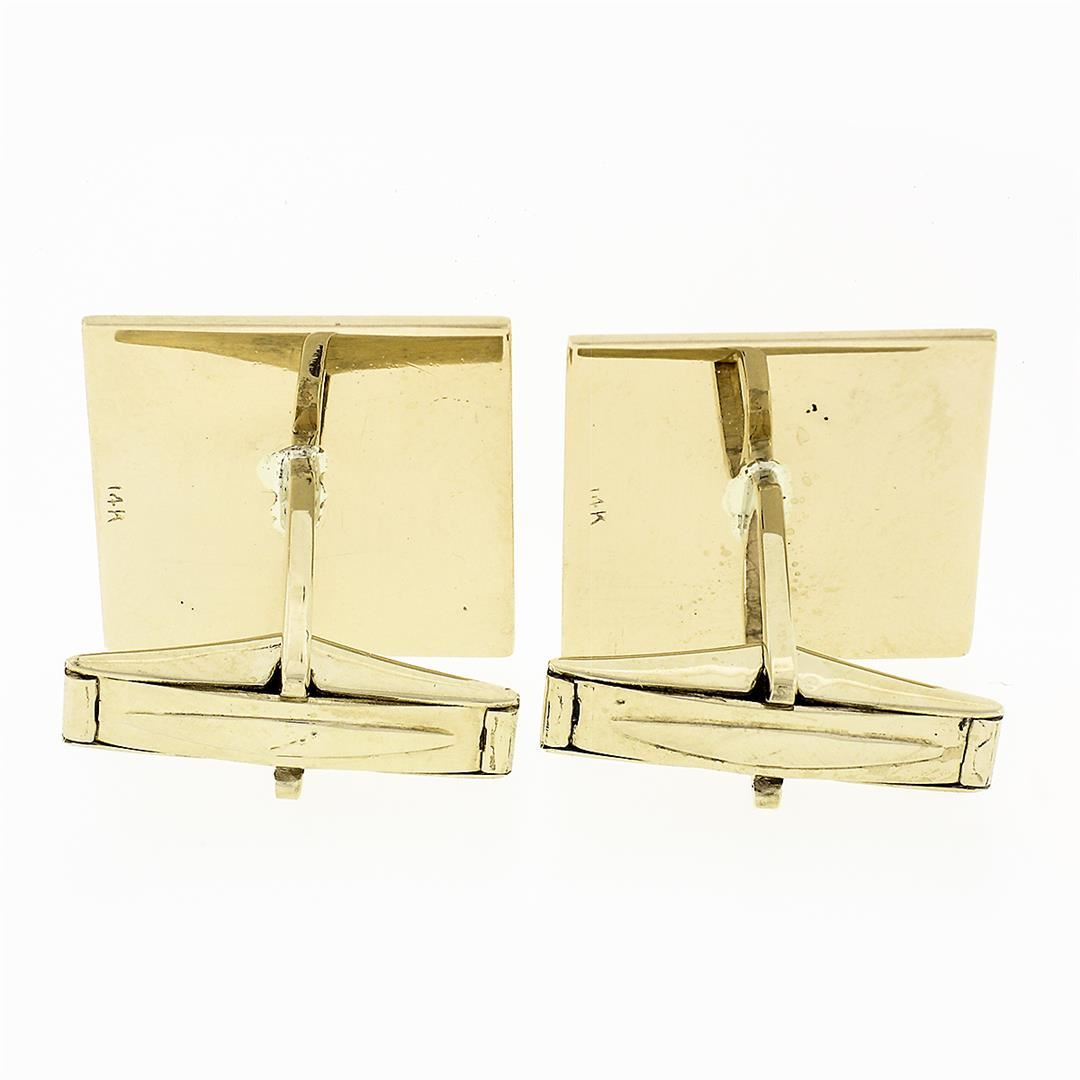An estate solid 14k yellow gold square cufflinkls. These cuff links have a swivel design with a clearance of 13.92mm, weigh a total of 18.43 grams, and the cuff link panel dimensions 18.9m, and the button stud panel dimensions 7.95mm.