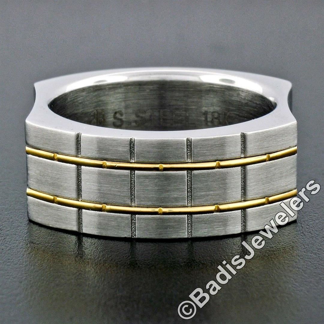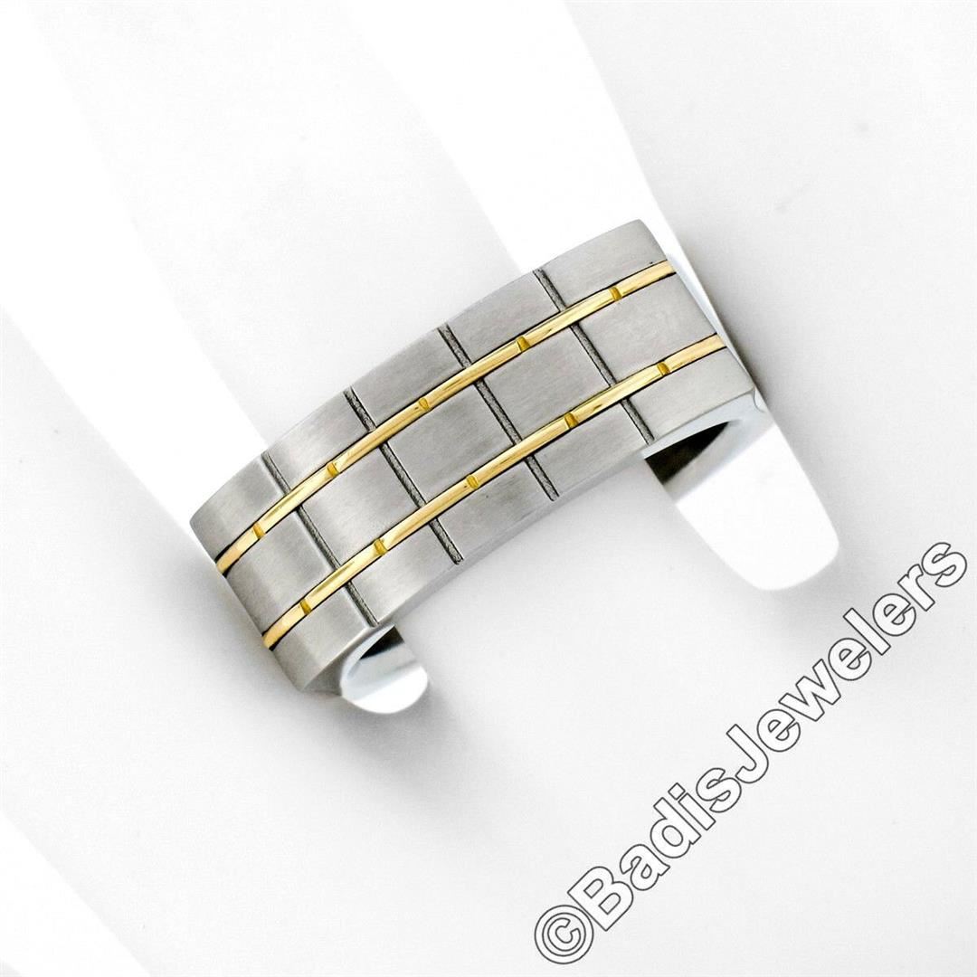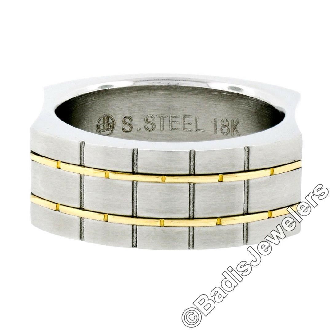 A men's stainless steel and 18kt yellow gold brick pattern domed band ring. The ring is size 11, weighs a total of 14.3 grams, and measures 9.45mm wide.