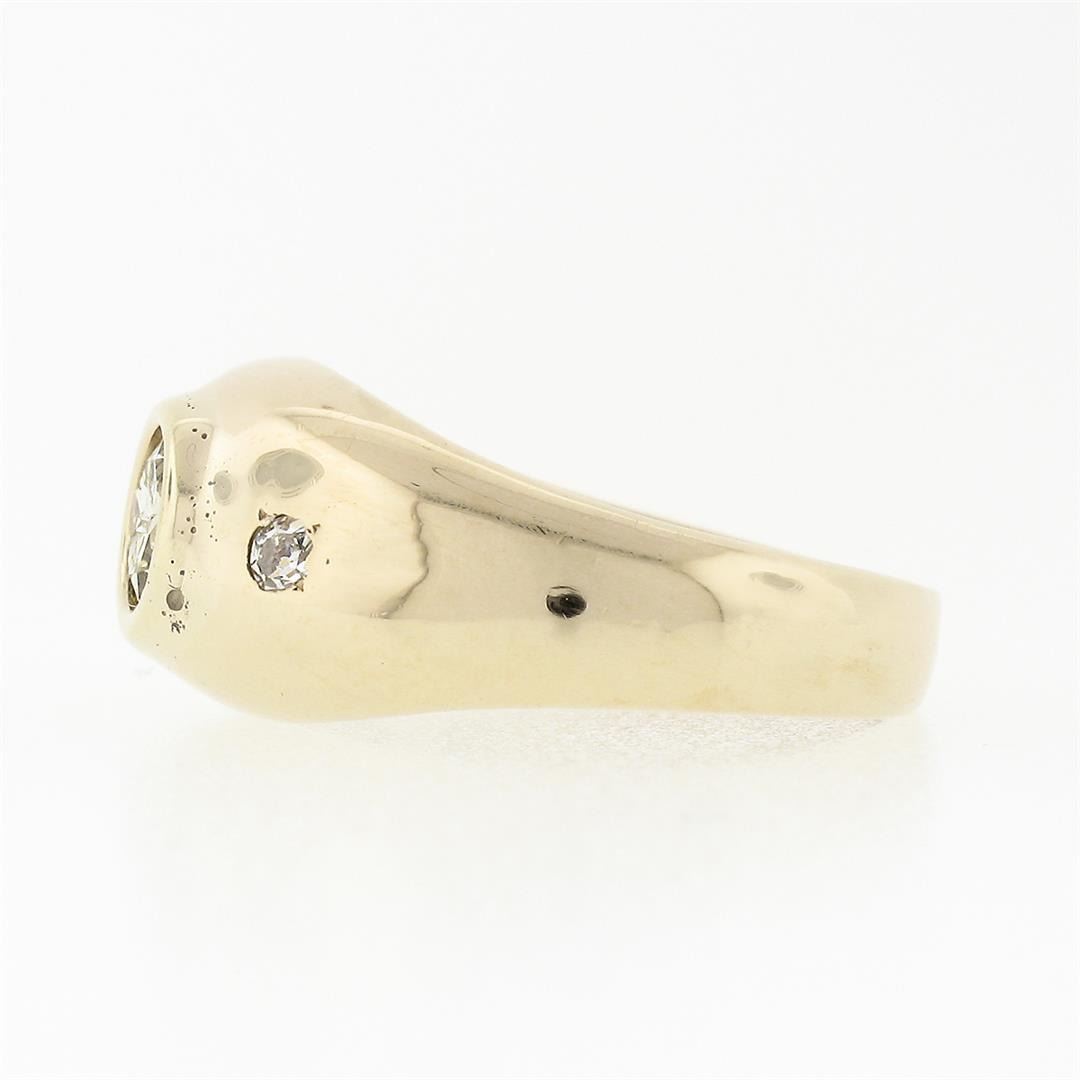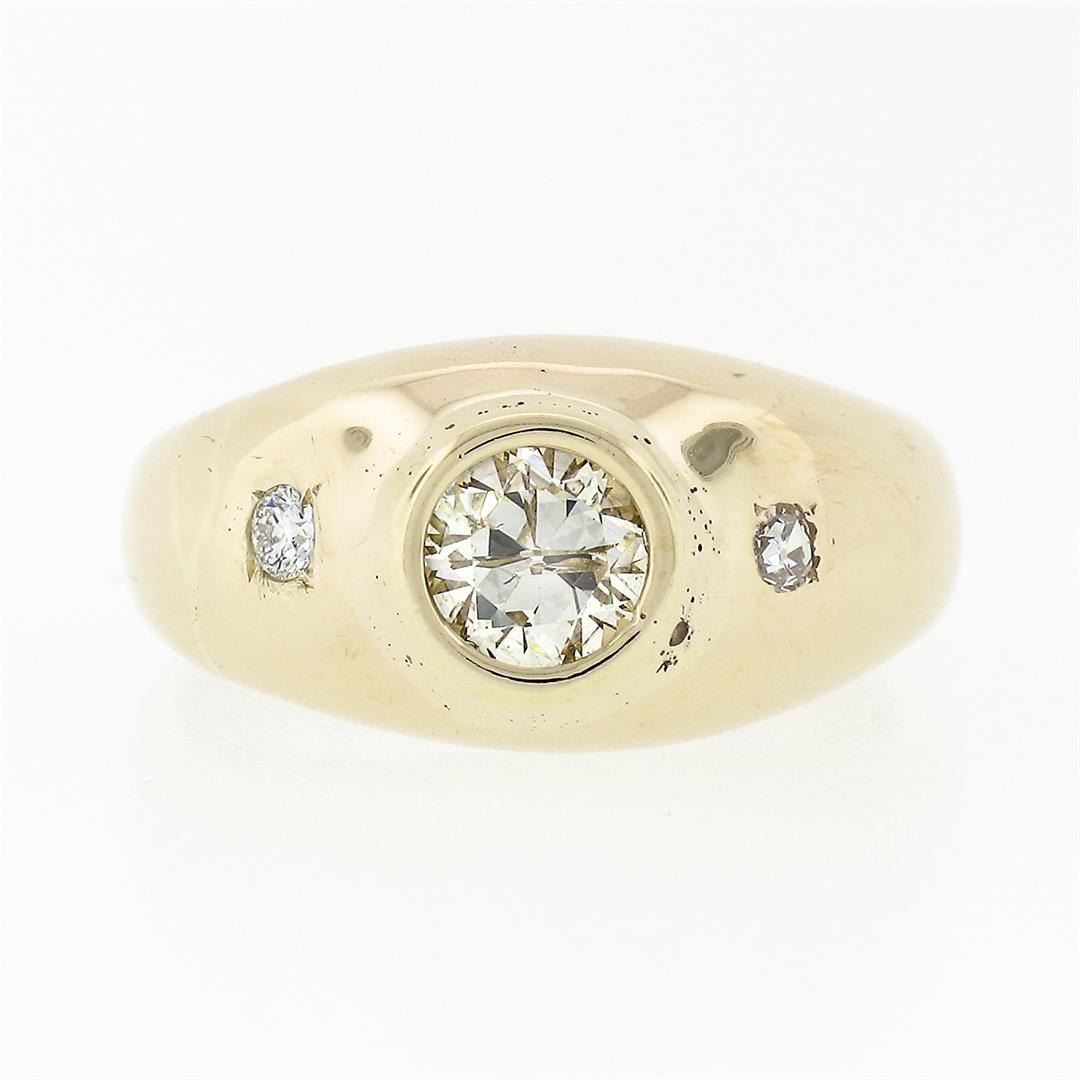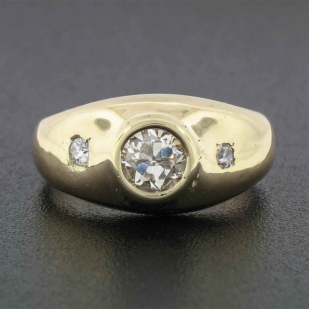 A vintage solid 14k yellow gold domed men's band ring, featuring 1 round brilliant cut natural diamond (J/K - SI2 ; 0.56ct), and 2 old single & round brilliant cut natural diamonds (G/H - VS2 ; 0.06ctw). The ring is size 6.5, weighs a total of 4.93 grams, and measures 9.9mm wide.